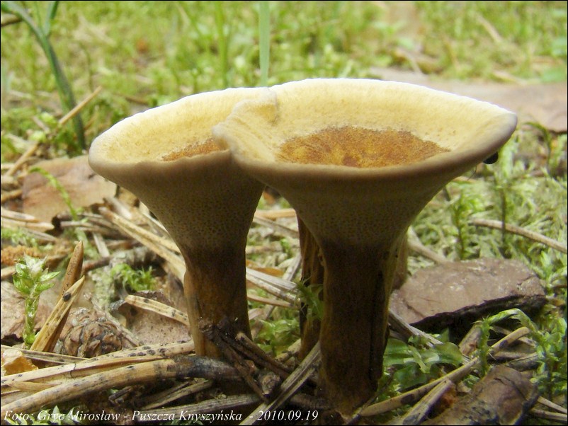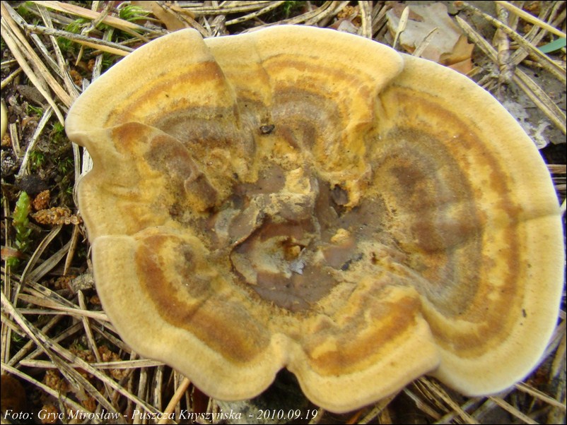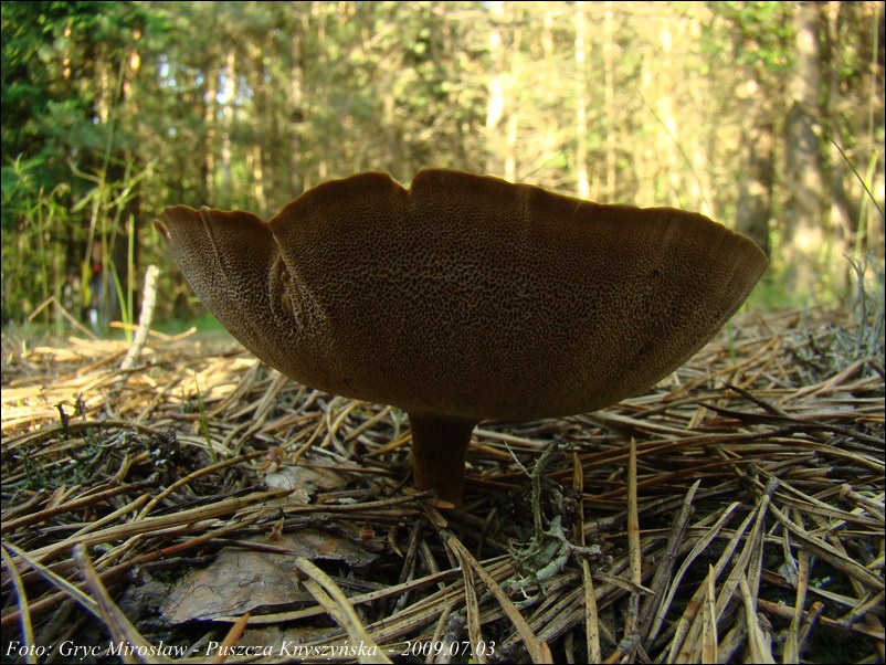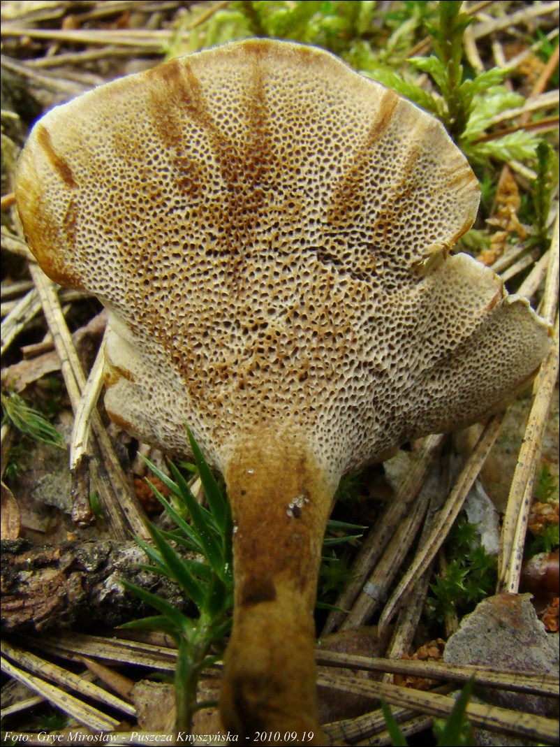 Hymenofor: rurki bardzo krótkie; pory od okrągłych do kanciastych, średnicy około 0.5 mm, początkowo białawe, z wiekiem nabierające barwy żółtobrązowej, rdzawobrązowej lub ciemnobrazowej, zbiegające na trzon.