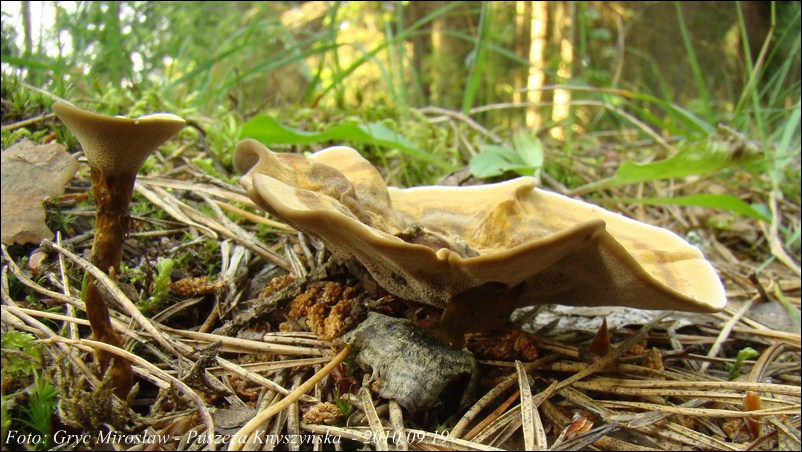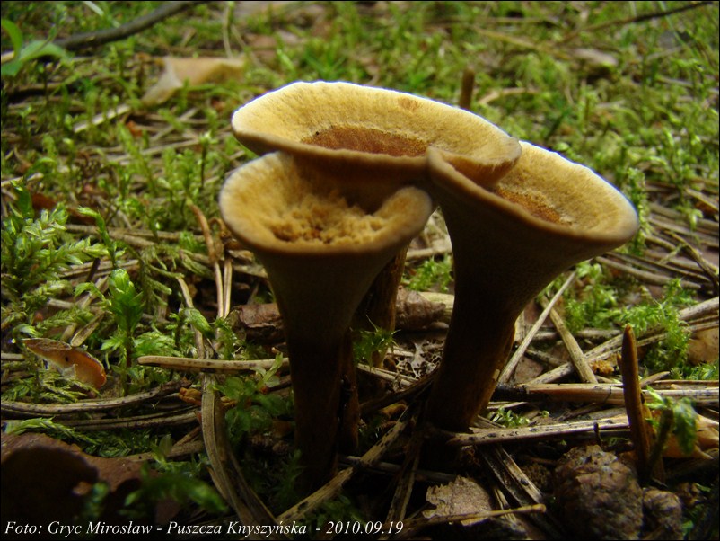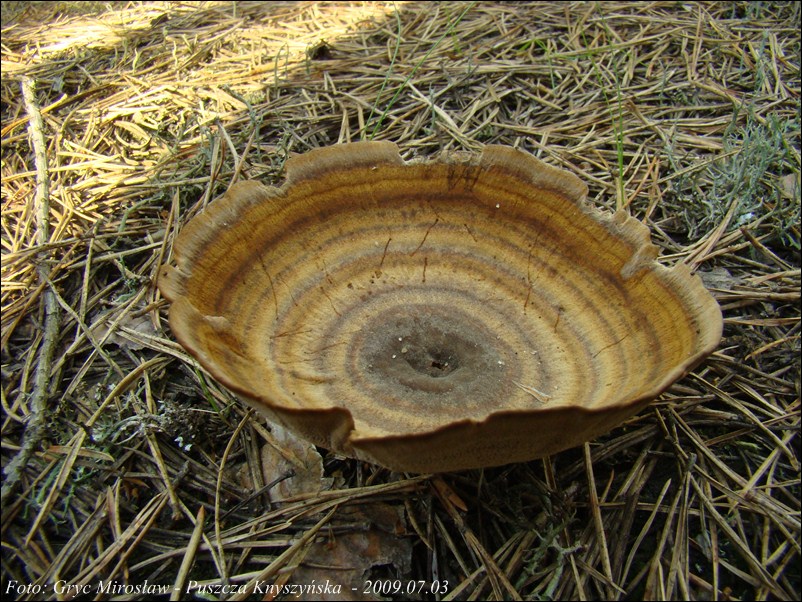 Kapelusz: o średnicy 5-6(10) cm, lejkowaty, z wiekiem staje się coraz bardziej rozpostarty, na trzonie osadzony zazwyczaj centralnie: brzegi proste, u starszych owocników nieregularnie pofalowane (fot. 05-06); powierzchnia barwy cynamonowobrązowej, żółtobrązowej lub szarobrązowej, koncentrycznie strefowana, u młodych owocników aksamitnie owłosiona, u starszych gładka.