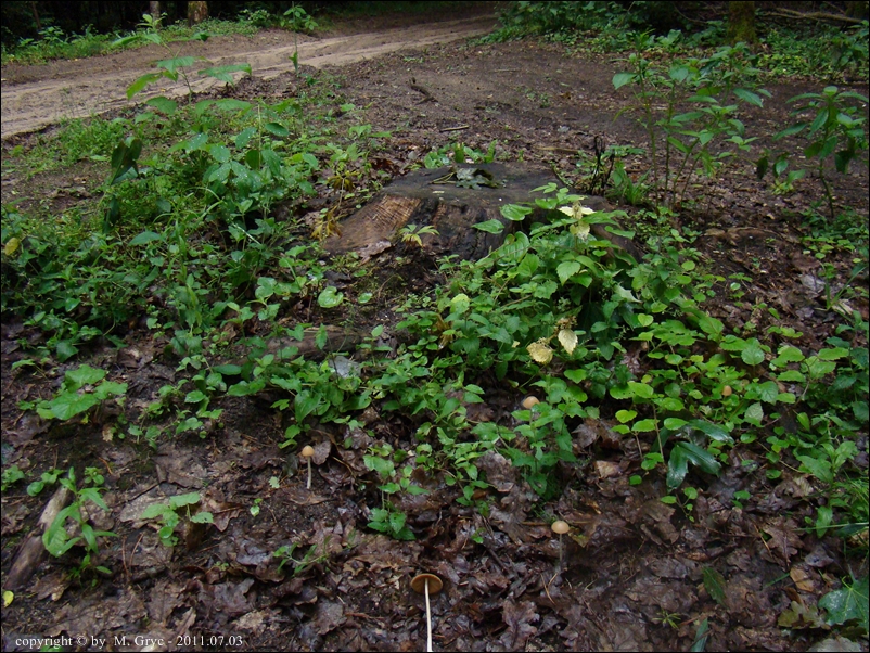 Substrat: Grupka owocników na poboczu drogi leśnej, podłoże użyźnione butwiejącymi resztkami drewna.