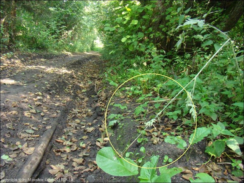 Siedlisko: Brzeg głebokiej koleiny, drogi biegnącej na nasypie w grząskim, podmokłym terenie. Wokół zadrzewienie liściaste: olcha, wierzba, rzadziej topola i brzoza.