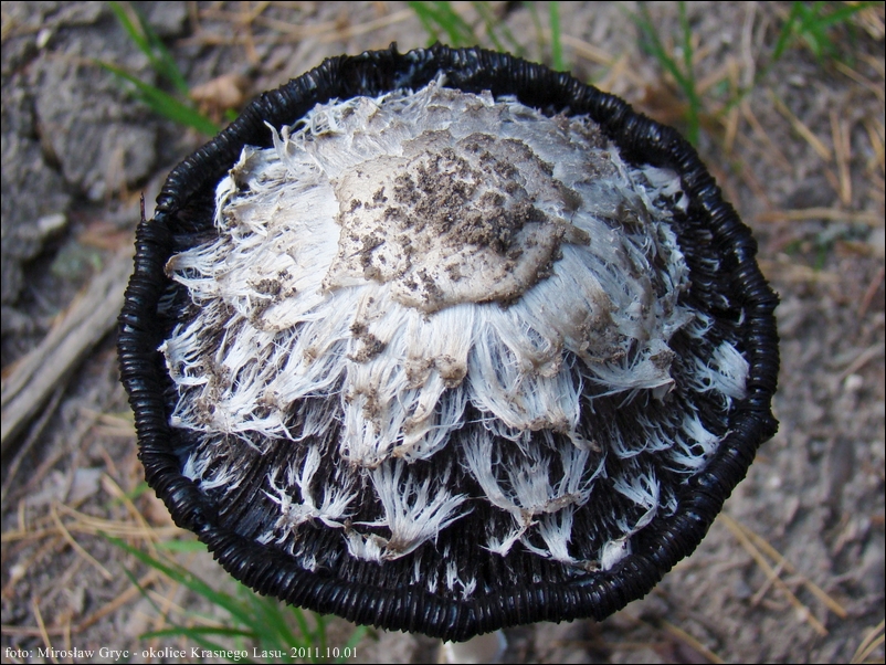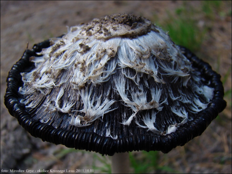 Kapelusz: barwy białej lub białawej, na szczycie zazwyczaj zabarwiony nieco ciemniej, ochrawobrązowo, młode kształtu jajowatego, przechodzące z wiekiem w dzwonkowaty; brzeg kapelusza wywija się do góry i czernieje, zaczyna powoli rozpływać się; powierzchnia pokryta włókienkami tworzącymi dachówkowato ułożone łuski; szczyt kapelusza zazwyczaj gładki.