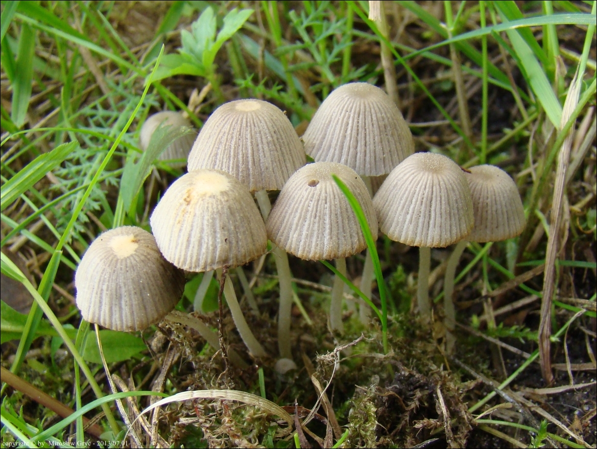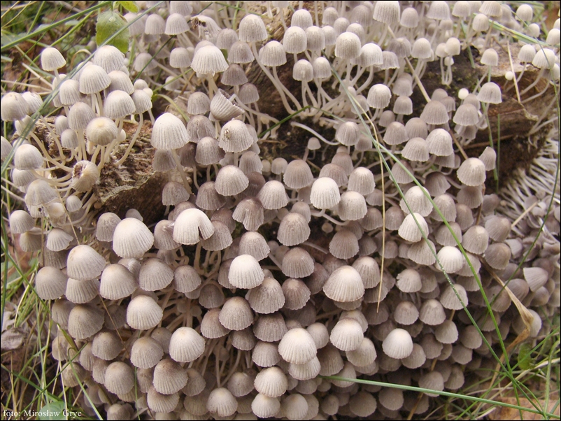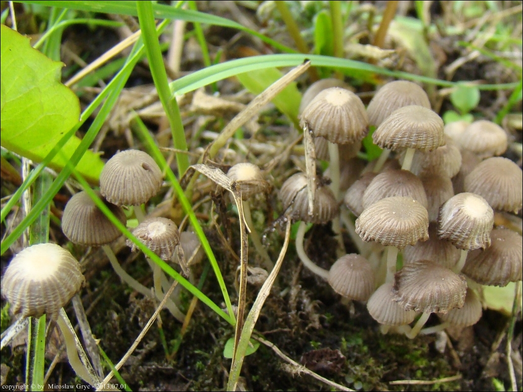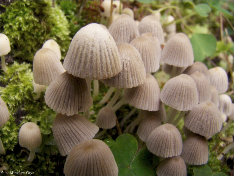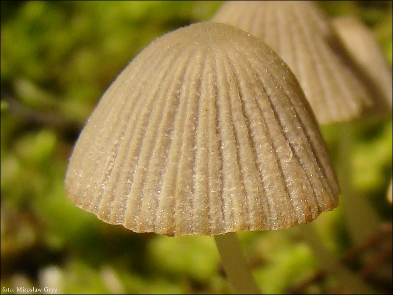 Kapelusz: kształtu dzwonkowatego, średnicą dorasta do 1.5 cm, młode barwy kremowej, jasnoochrowej, szarożółtej, beżowej lub ochrawożółtej, starsze, szarej w różnych odcieniach; skóra matowa, filcowata, promieniście, delikatnie prążkowana; kapelusze nie rozpływaja się tak jak u większości przedstawicieli tego rodzaju.