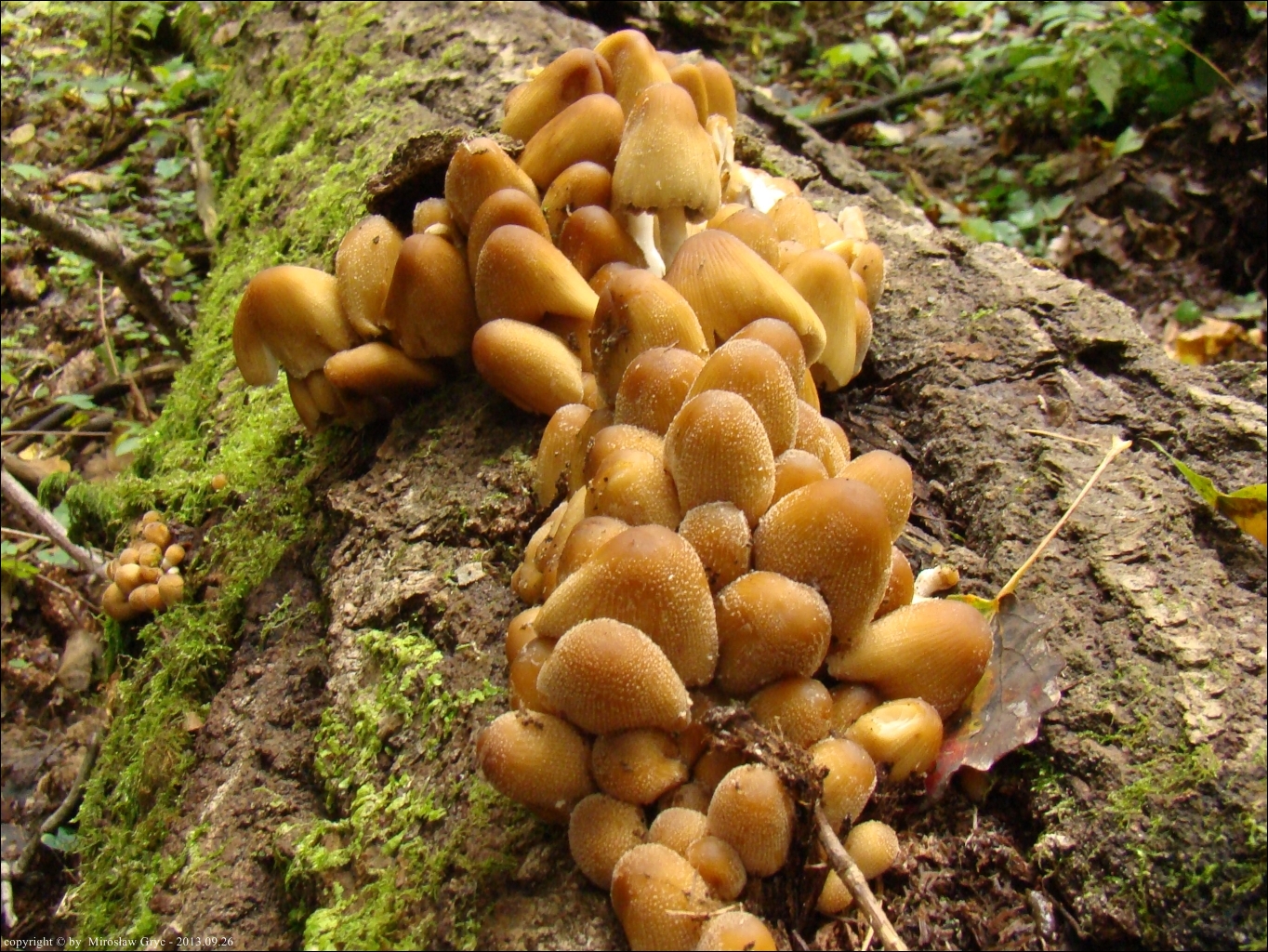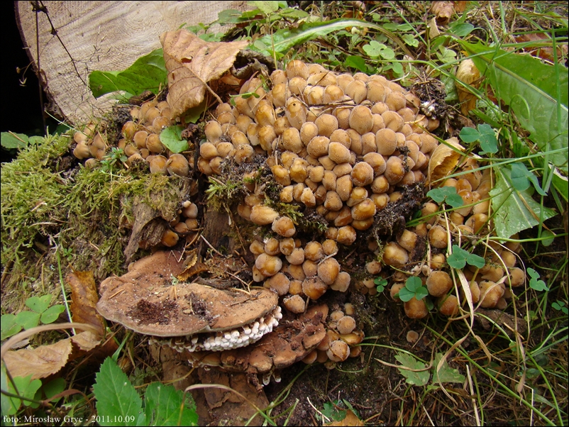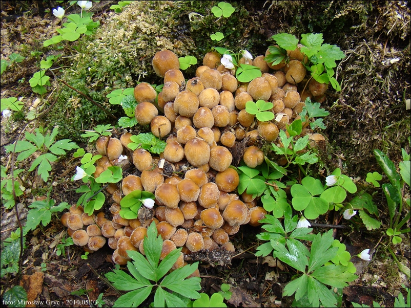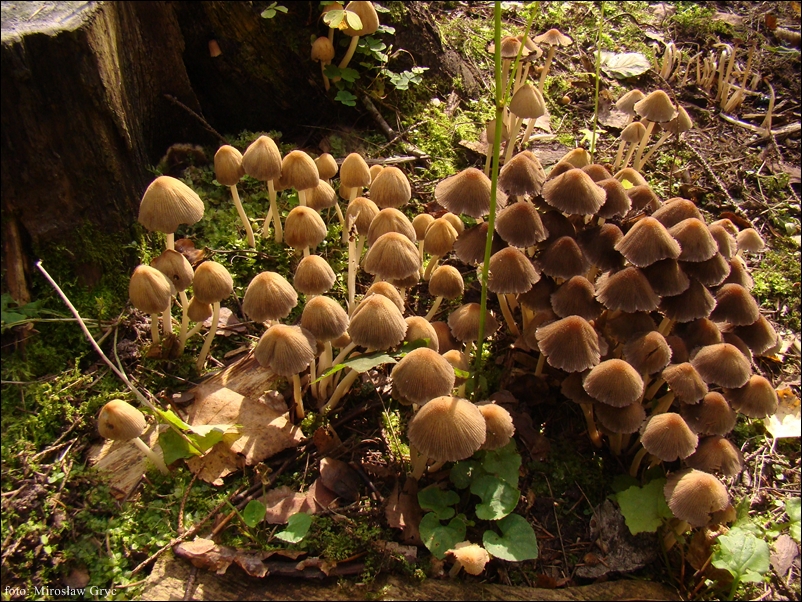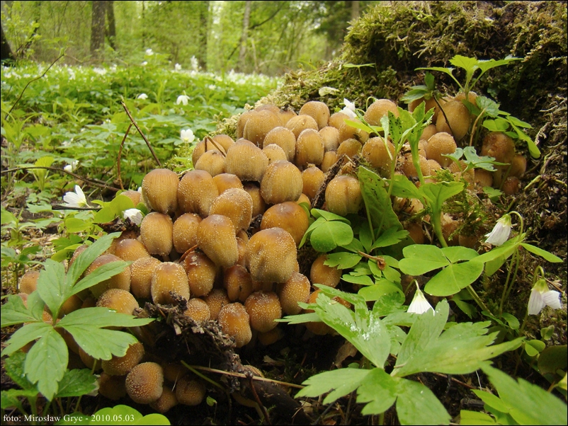| 2016.05.03 | Puszcza Knyszyńska, okolice Czołnowa; skraj zrębu. | Grupa kilkudziesięcu owocników na zbutwiałym pniu oraz na ziemi wokół niego. Numer wątku na Bio-Forum: 33/874128. Mikroskopował Błażej Gierczyk. Publikacja: Błażej Gierczyk, Mirosław Gryc (2024). Materiały do poznania grzybów podstawkowych Puszczy Knyszyńskiej i jej przedpola. Przegląd Przyrodniczy XXXV, 2 (2024): 3-65 (jako: Coprinellus micaceus). |