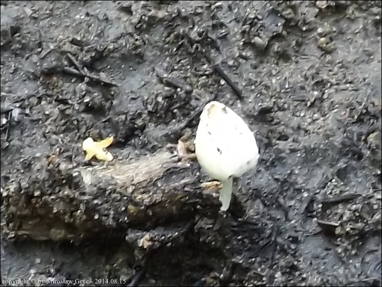 Substrat: Fragment drewna wgnieciony w podłoże, miejsce pokryte popiołem po spalonym sianie.