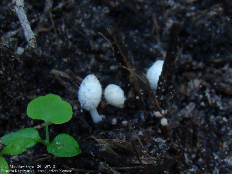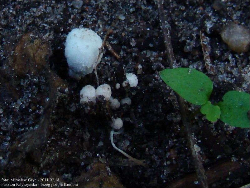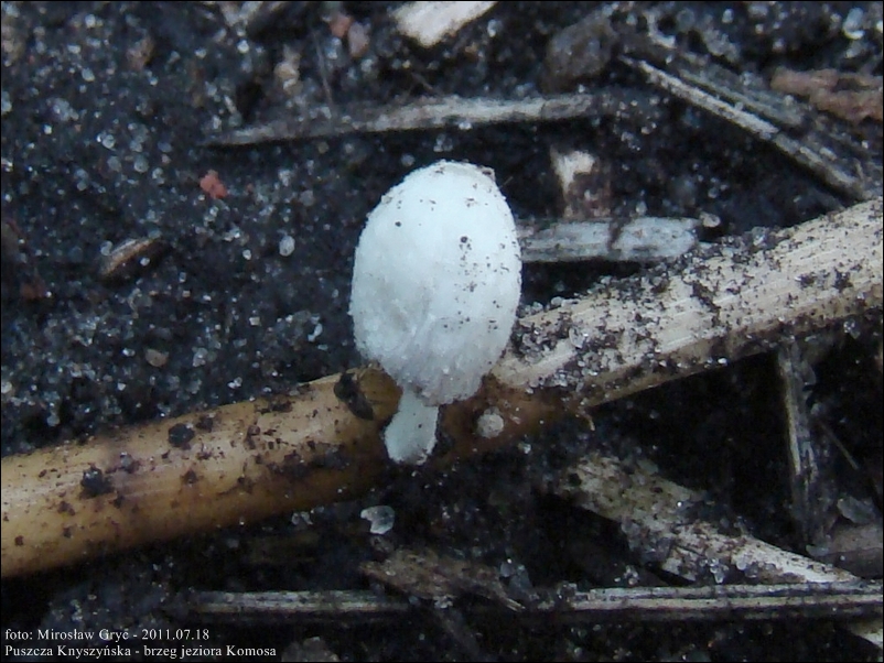 Substrat: Kilka drobniutkich owocników rosnących na zagrzebanych częściowo w ziemi szczątkach roślinnych (prawdopodobnie kawałki połamanych trzcin).