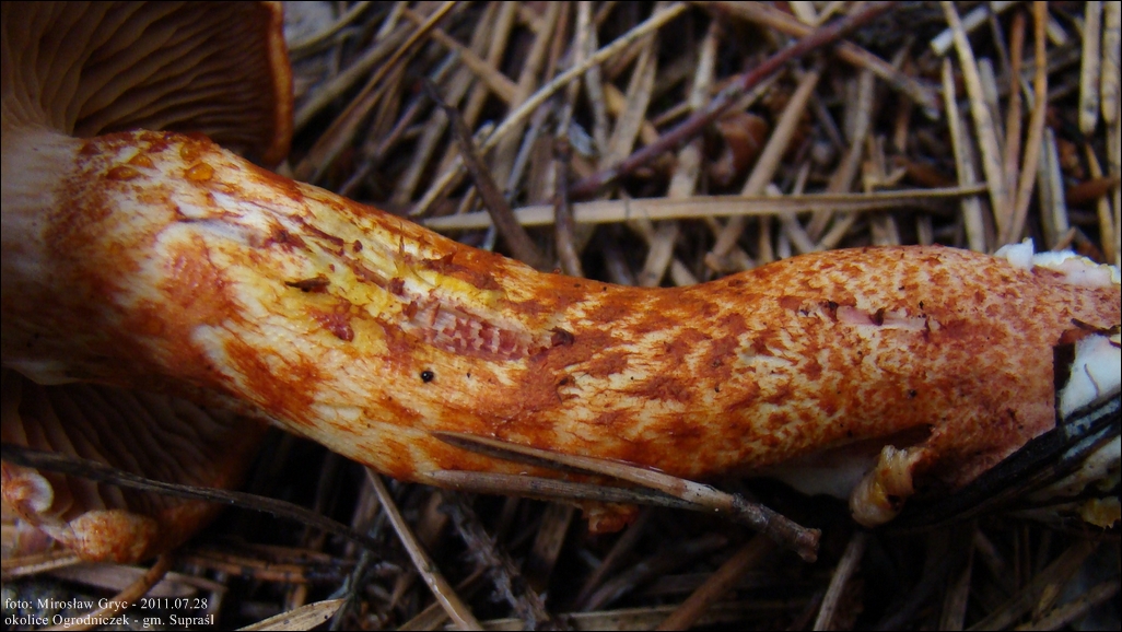 Trzon: u góry, nad strefą zasnówki, o barwie białożółtawej, niżej pokryty cynobrowoczerwonymi włókienkami, często zbitymi w kształt łuseczek; równogruby lub ze zgrubiałą podstawą w kształcie bulwki.