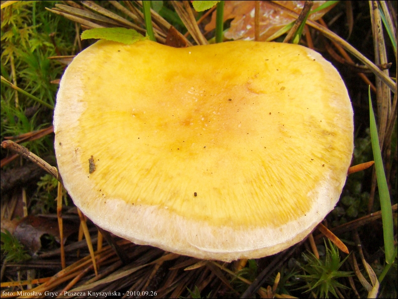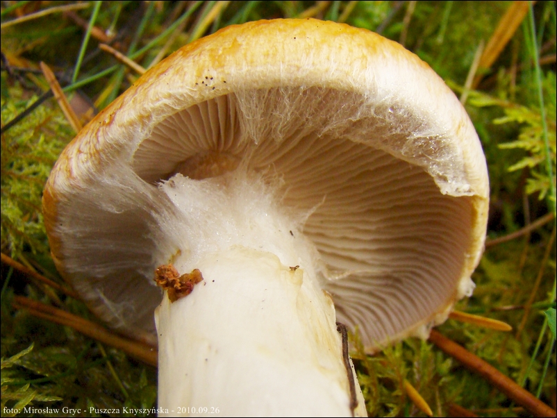 Kapelusz: średnicy 8-15 cm; barwy kremowej, ochrowożółtej lub pomarańczowożółtej, znacznie jeśniejszej na krawędzi, pokrytej białymi jedwabistymi włókienkami.