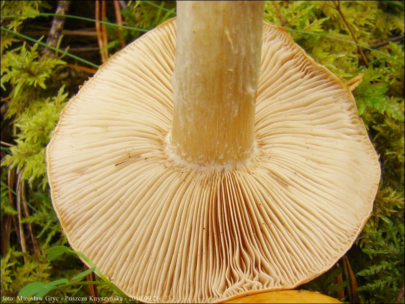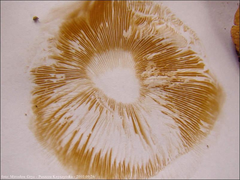 Blaszki: gęste, barwy białawej lub kremowej; ostrza ząbkowane, często oprószone na rdzawo przez zarodniki.