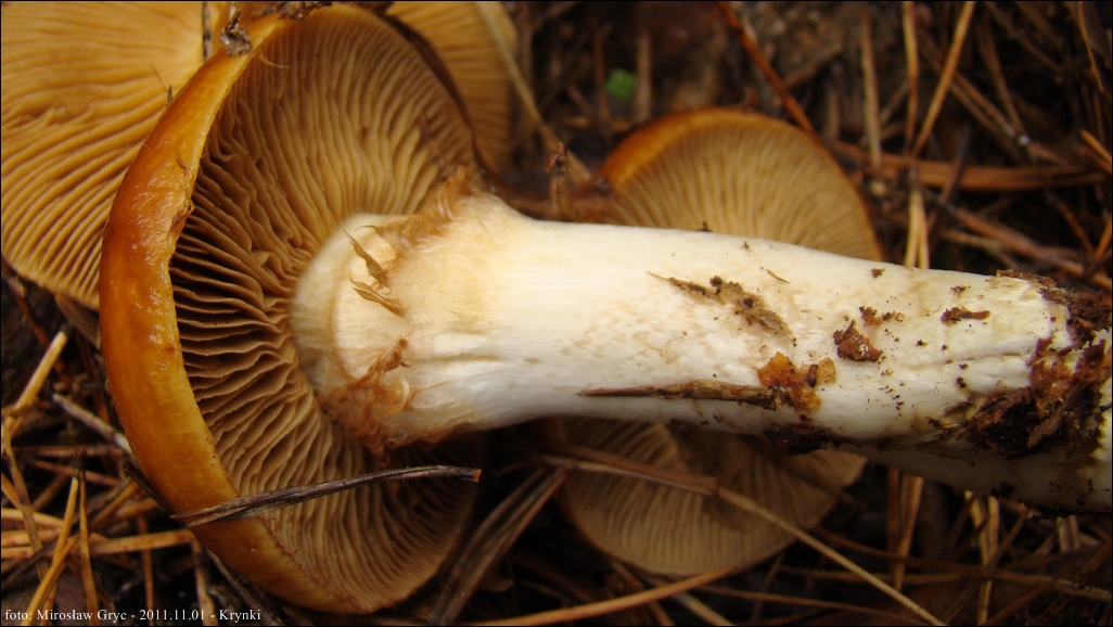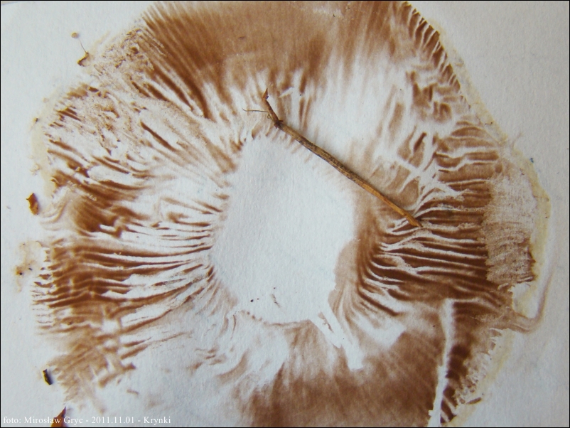 Blaszki: barwy jasnogliniastej do rdzawej, przyrośnięte do zbiegających; ostrza ząbkowane.