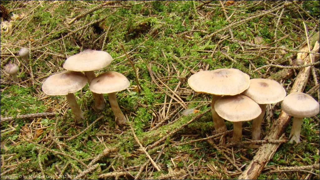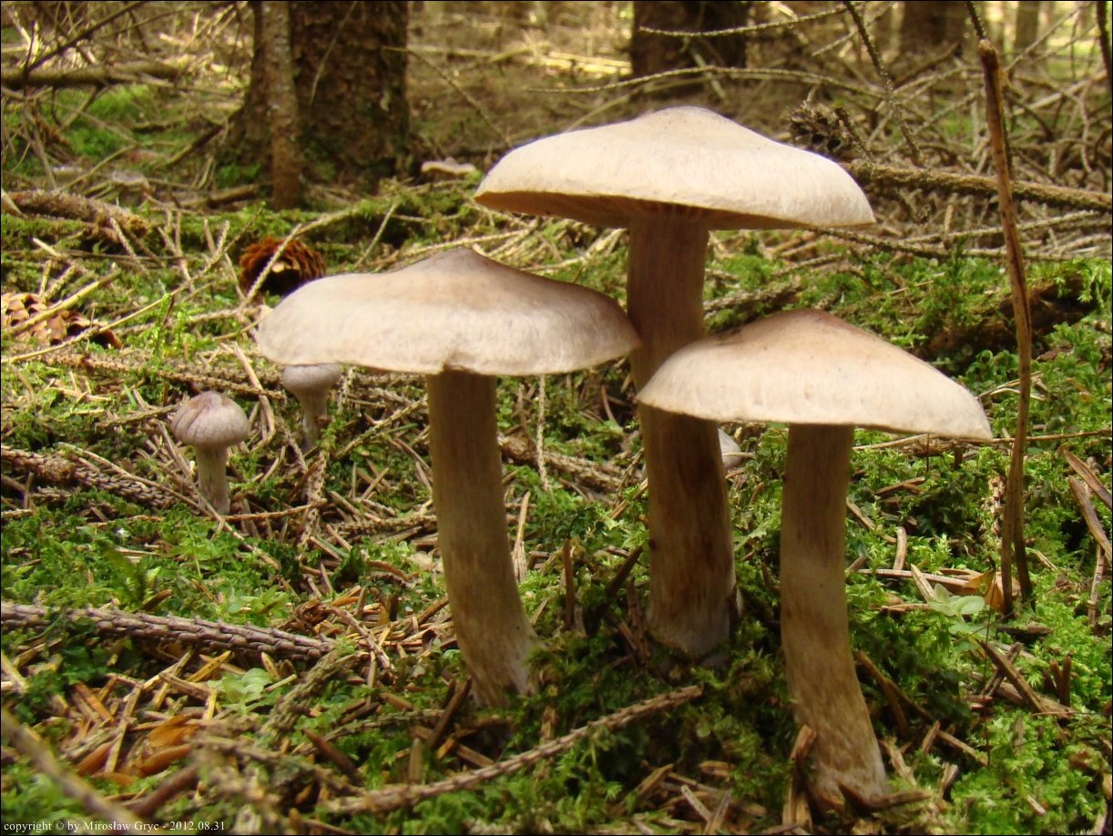 Substrat: Kilkanascie owocników na ziemi usłanej grubą warstwą igliwia i świerkowego chrustu.