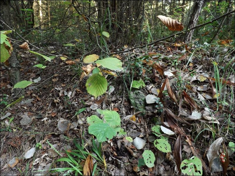 Siedlisko: Przydrożna skarpa w dość młodym lesie. W pobliżu leszczyna, nieco dalej dąb, grab, brzoza, na drugim planie iglaste (sosna, świerk).