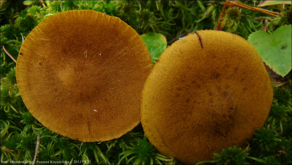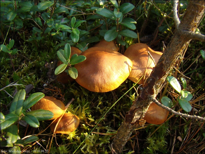 Substrat: podłoże piaszczyste, porośnięte gęsto mchami oraz borówką brusznicą / samotny owocnik na mocno zbutwiałym pniaku (prawdopodobnie sosnowy).