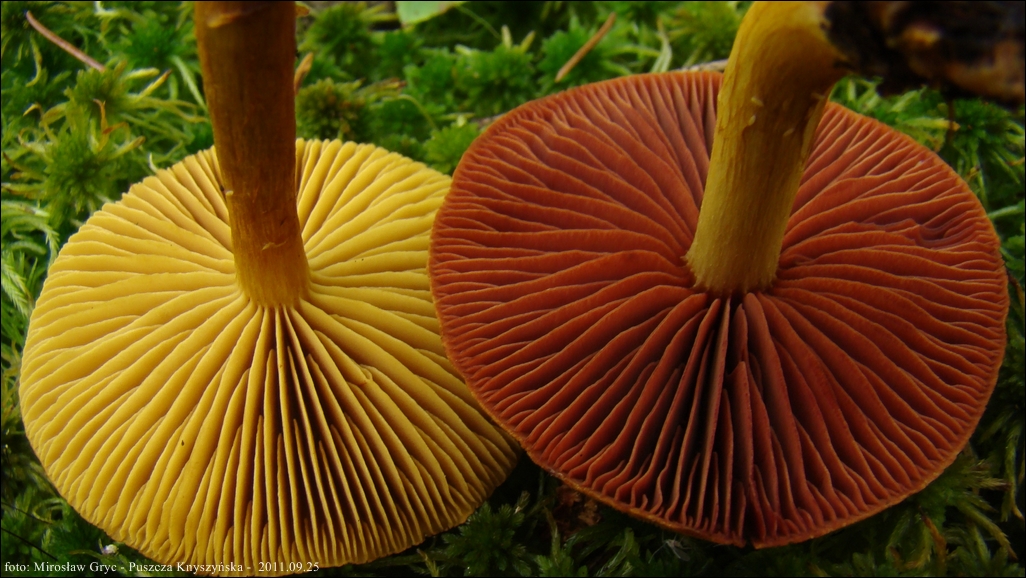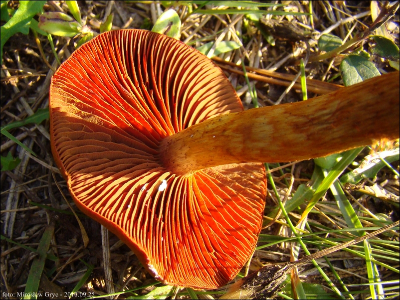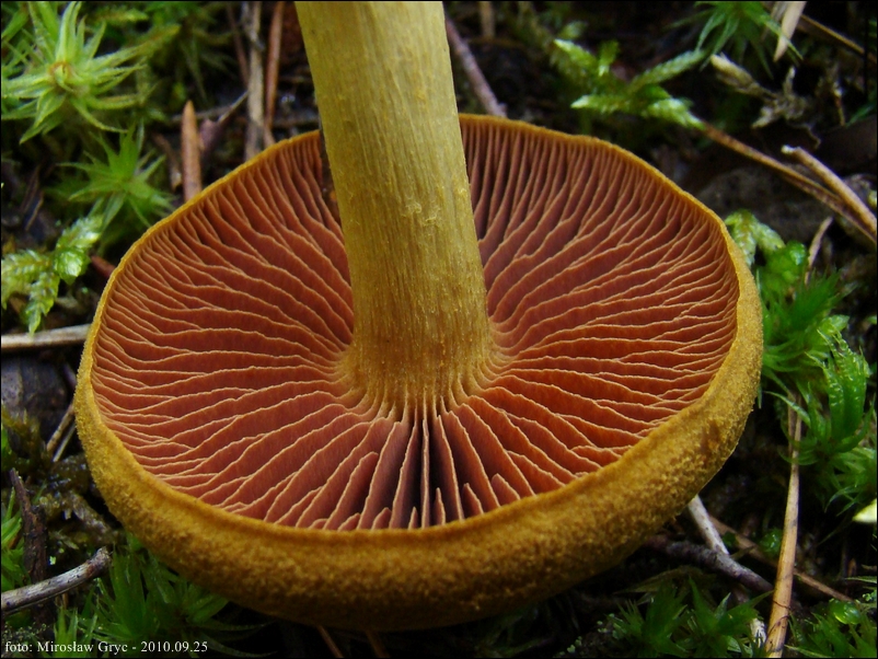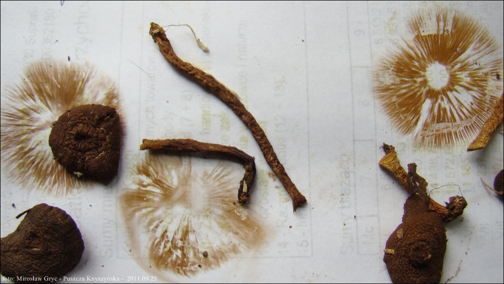 Blaszki: przyrośnięte zatokowato, początkowo barwy krwistoczerwonej a następnie brązowoczerwonawej.