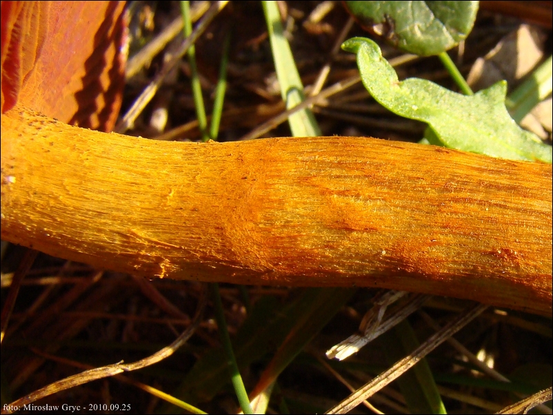Trzon: przeważnie długi, cienki i łamliwy; powierzchnia podłużnie włókienkowana, chromowożółta, pigwowożółta lub barwy mosiądzu; podstawa dość często zabarwiona na czerwono.