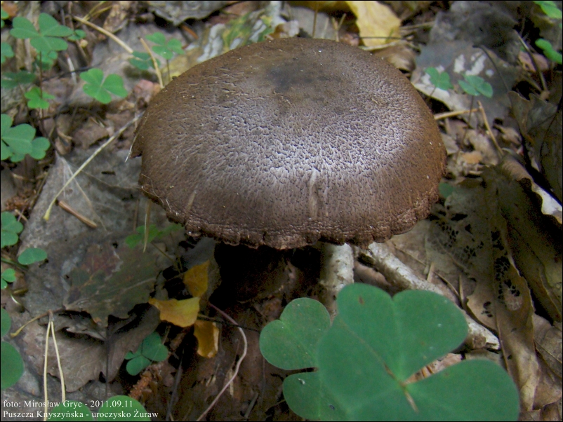 Kapelusz: za młodu barwy niebieskofioletowej (fot.11), z wiekiem coraz bardziej brązowofioletowy (fot.12) aż do prawie zupełnie brązowego (fot.14); średnicą dorasta do 8 cm, sporadycznie do 10; początkowo półkolisty, nastepnie wypukły aż do płaskiego; brzeg długo podwinięty i połączony z trzonem bladofioletową zasnówką, czasem z centralnym garbkiem; powierzchnia za młodu z metalicznym połyskiem, z wiekiem coraz bardziej łuseczkowata.