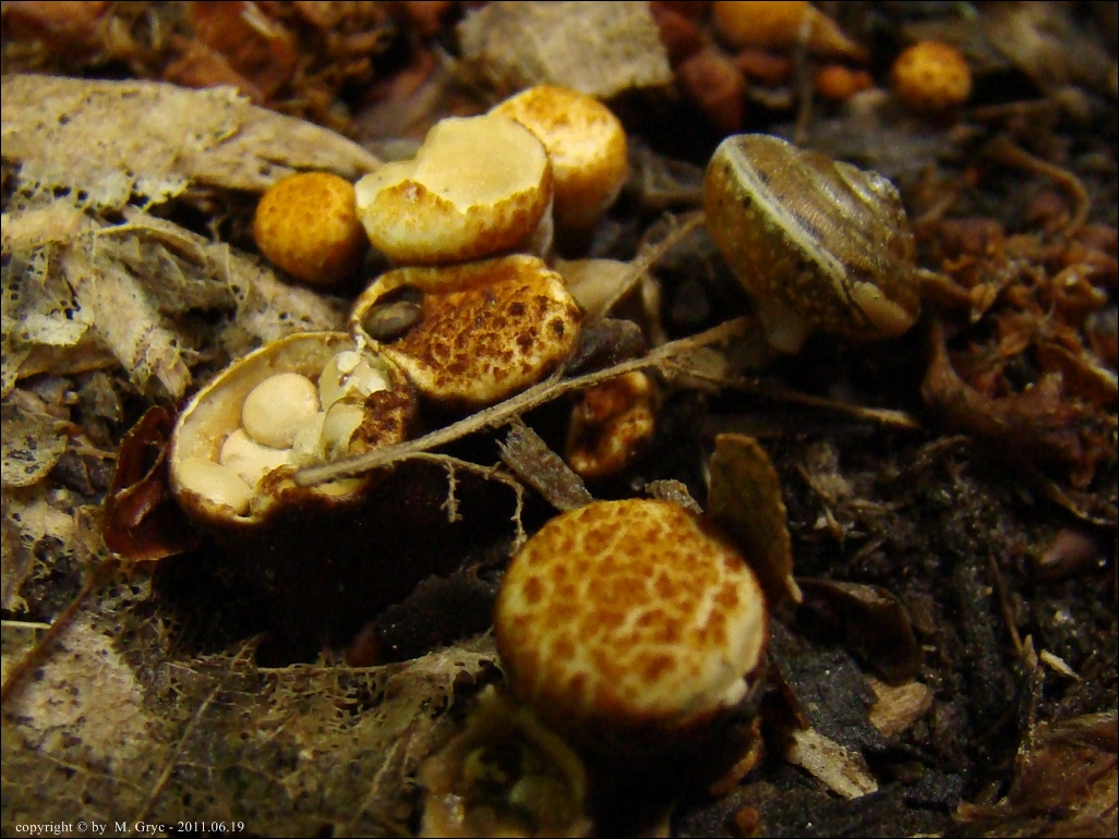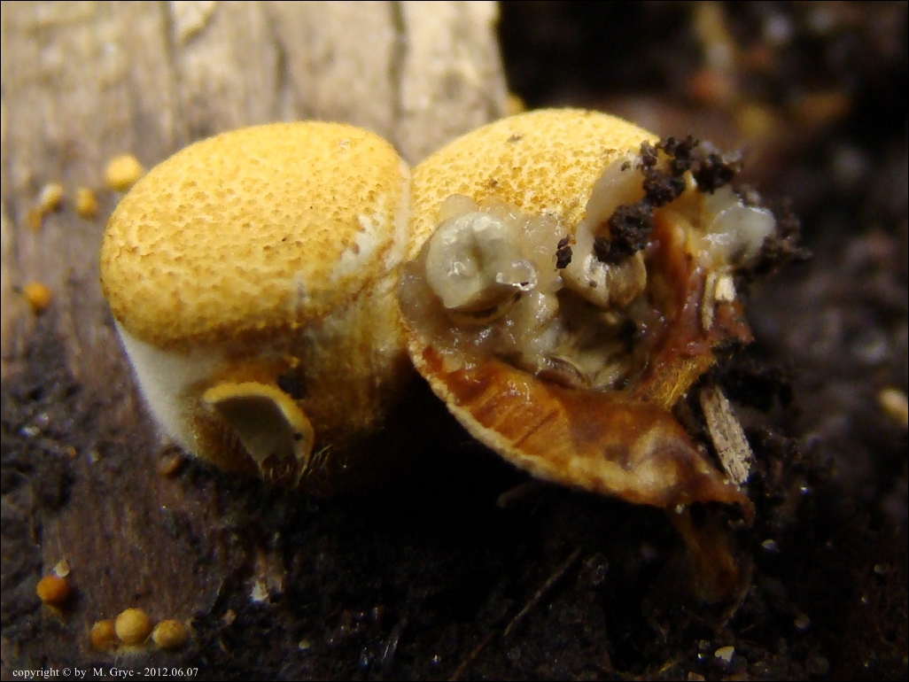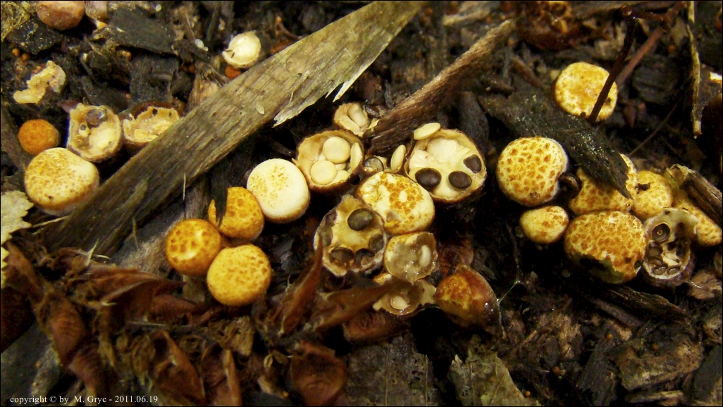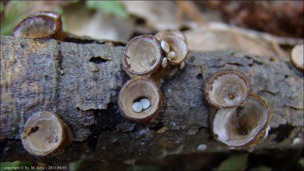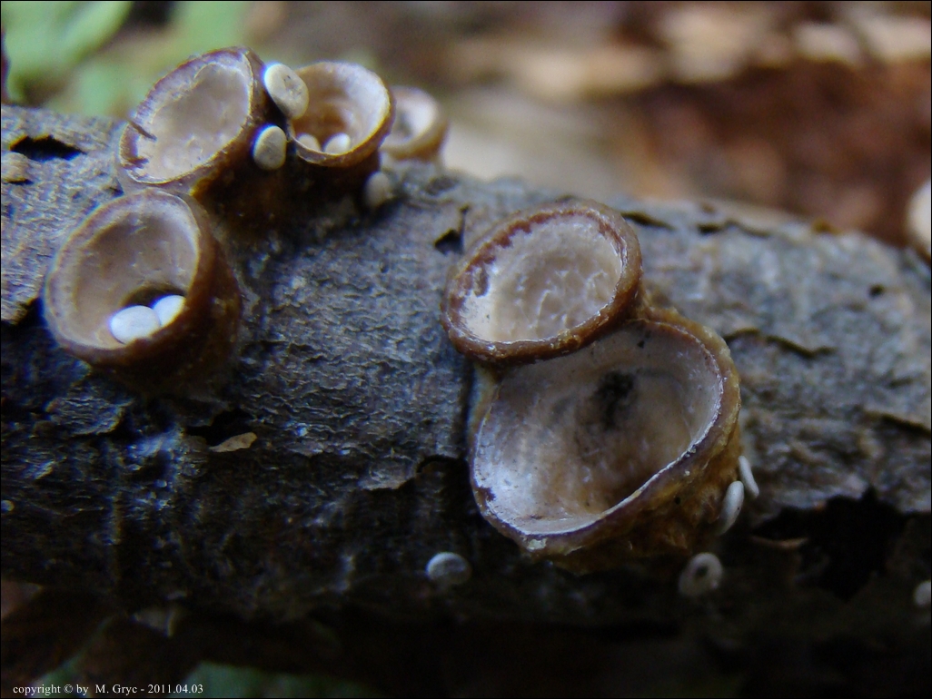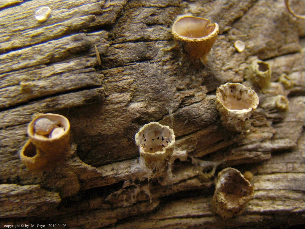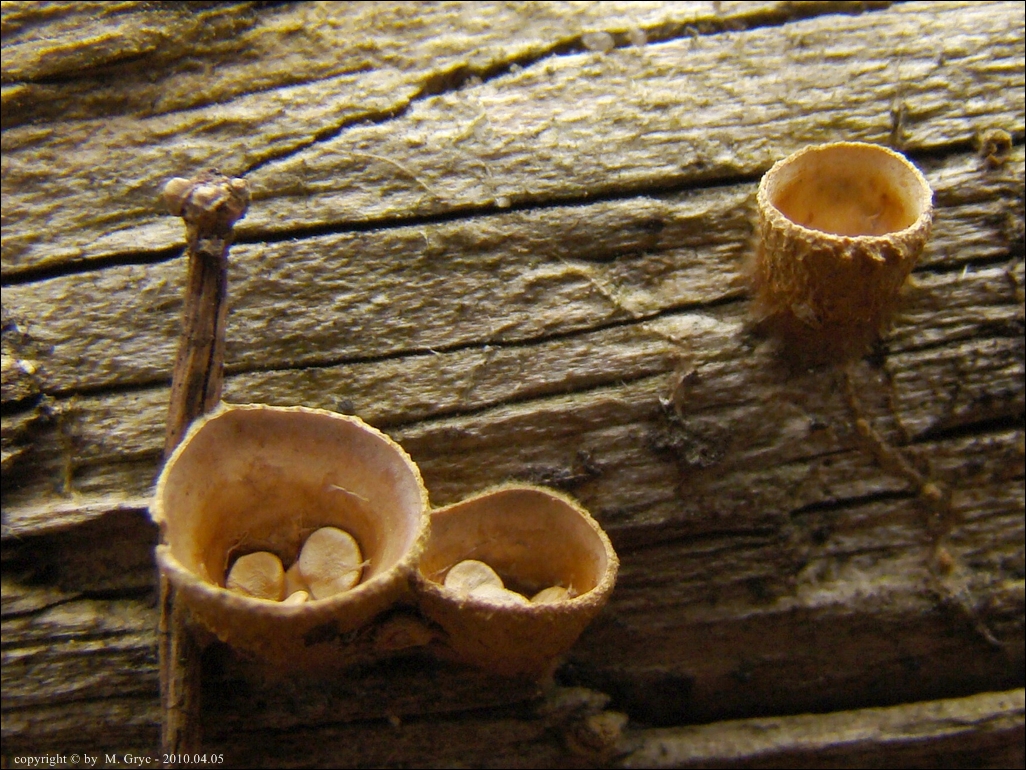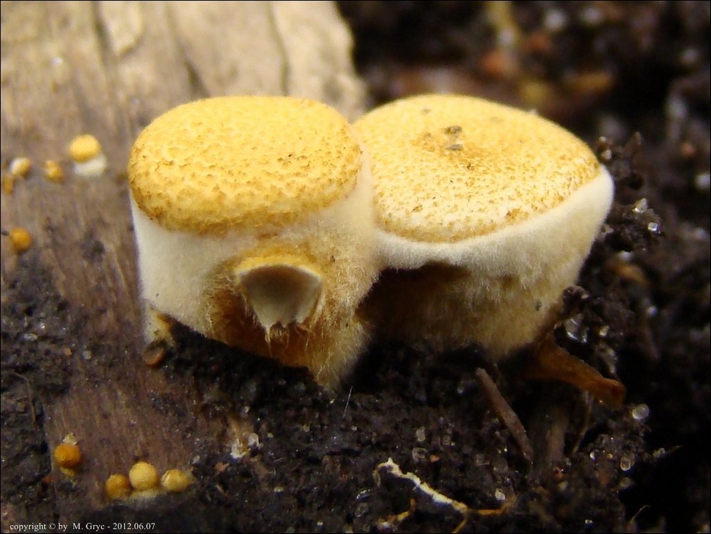 Owocniki: średnicy 0,5-1 cm, wysokości do 1,2 cm; początkowo kulistawe lub nieco cylindryczne, pilśniowato zamszowe, szorstko kutnerowate; powierzchnia boczna prawie biała, góra żółtawa, brudnopomarańczowa lub cynamonowa; w miarę dojrzewania owocniki osiągaja kształt czarki lub grubościennego, szarawobrązowawego kubeczka, początkowo zakrytego jasną, jasnożółtawą lub prawie białą epifragmą.