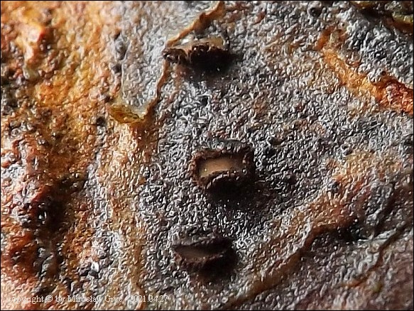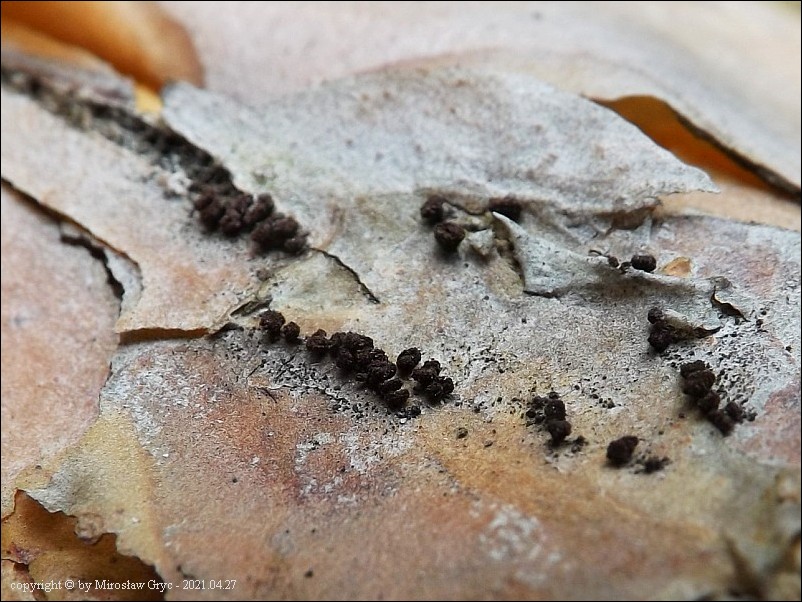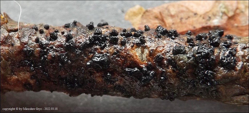 Owocniki na martwych gałazkach sosny zwyczajnej (Pinus sylvestris).