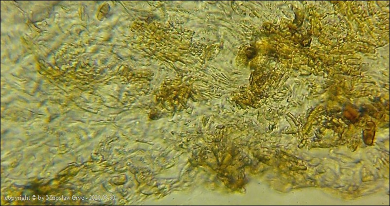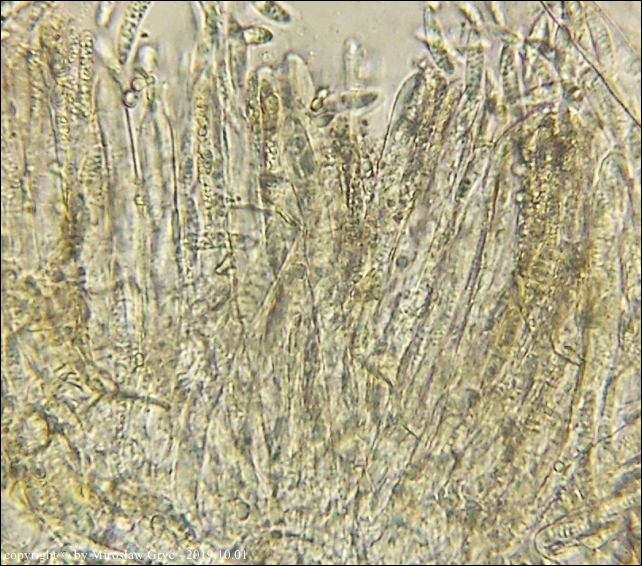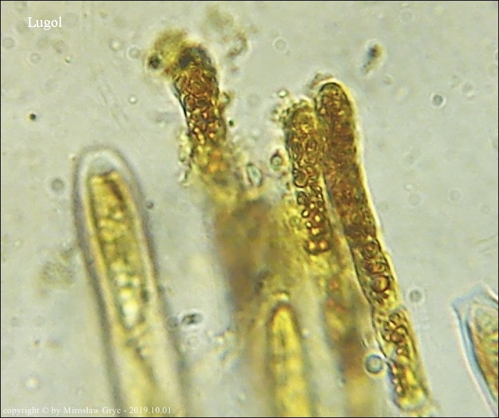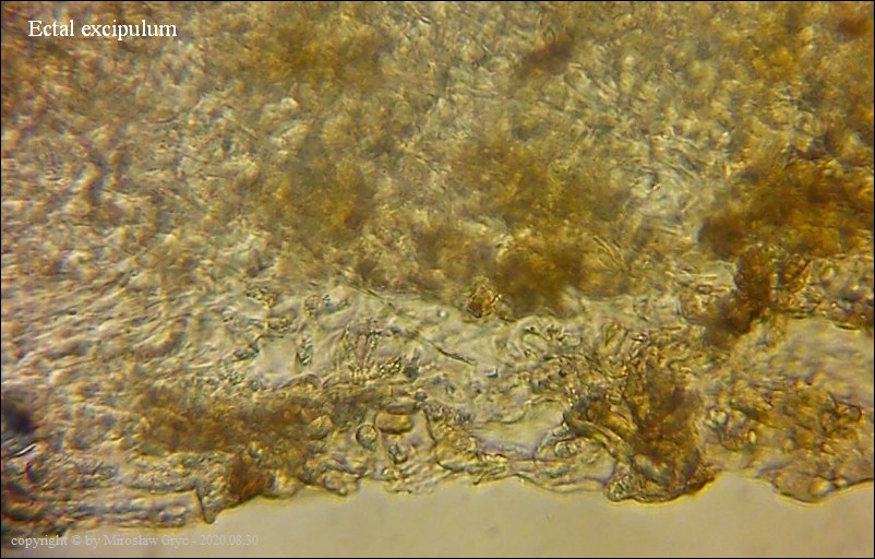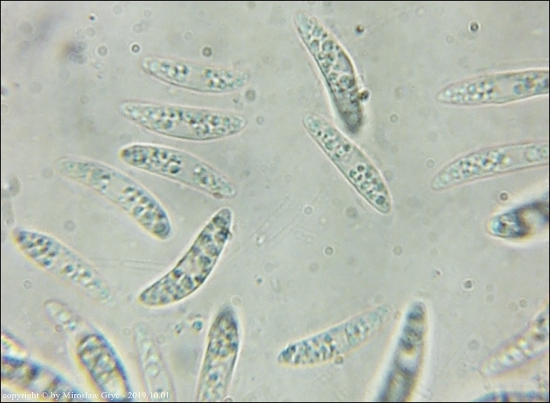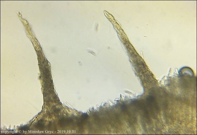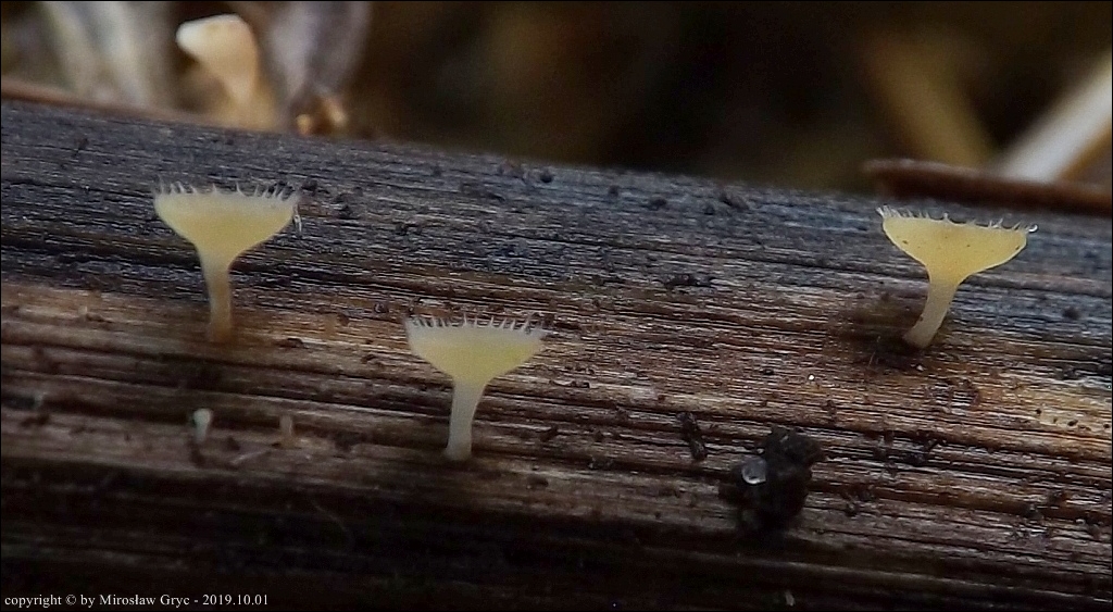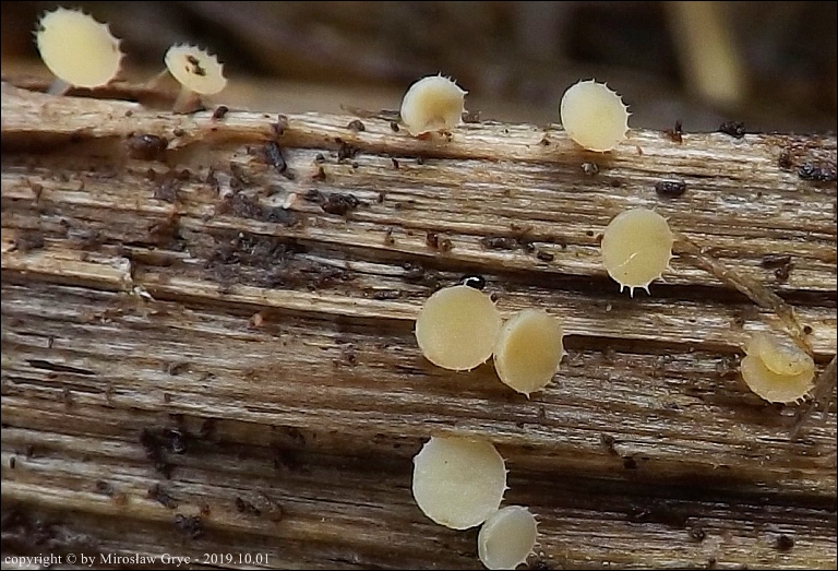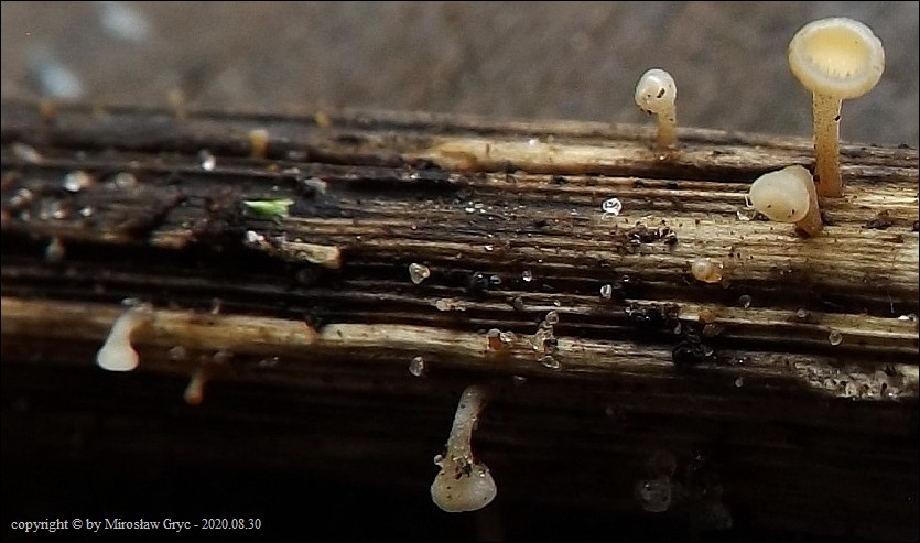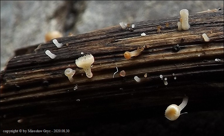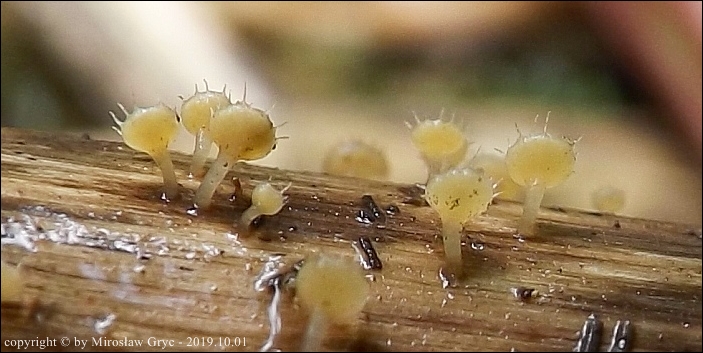 | 2017.09.22 | Skraj Puszczy Knyszyńskiej, około 2 km E od Ogrodniczek, brzeg jez. Komosa. | Owocniki na martwych pędach topinamburu, wyrastające razem z Hymenoscyphus scutula. |