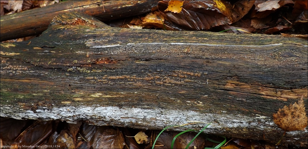 Substrat: Owocniki na leżącym na ziemi słupku dębowych, służącym poprzednio do grodzenia szkółki leśnej.