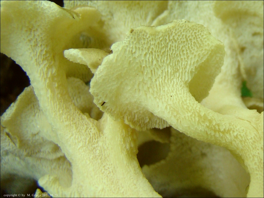 Hymenofor: rurkowaty; rurki krótkie do 1.5 mm długości, słomkowożółte, daleko zbiegające na trzon.