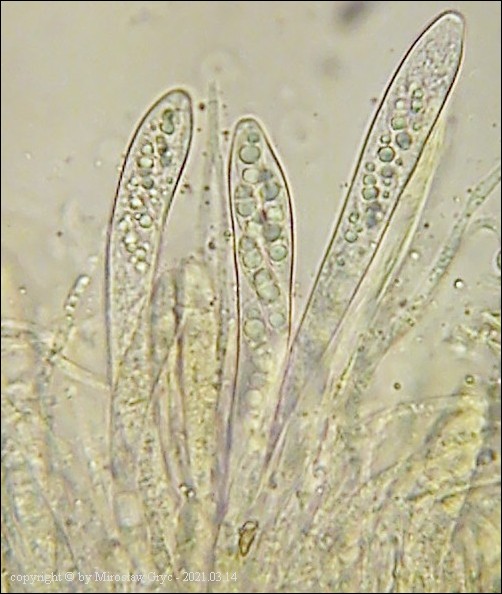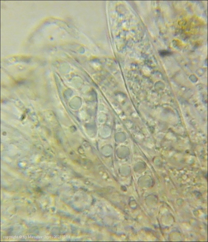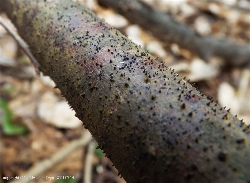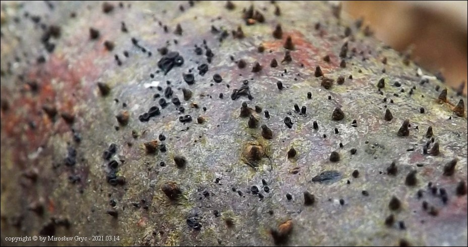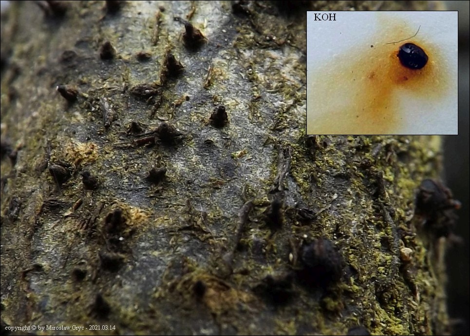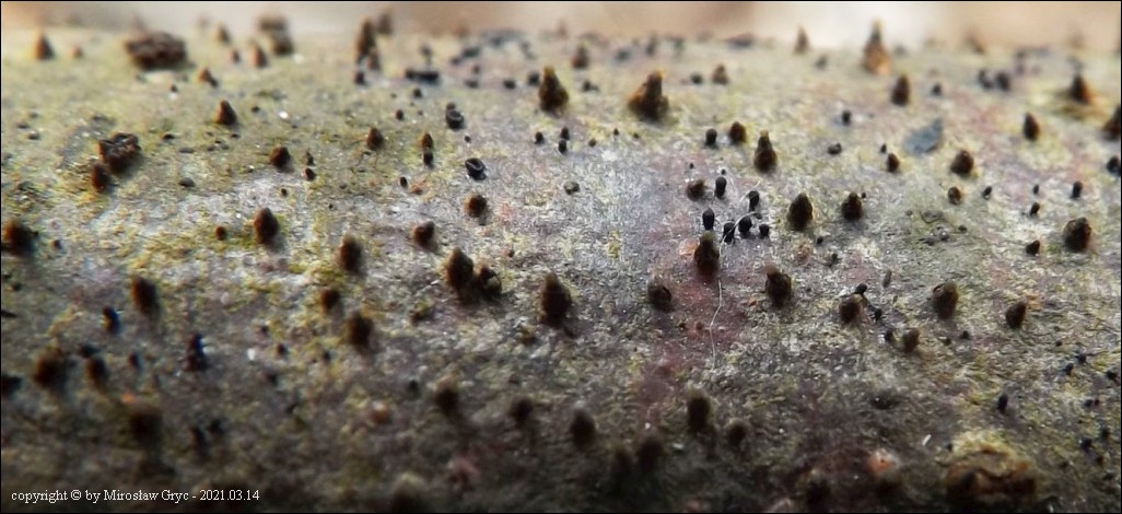 Substrat: Owocniki na martwych gałęziach czeremchy zwyczajnej (Prunus padus) .