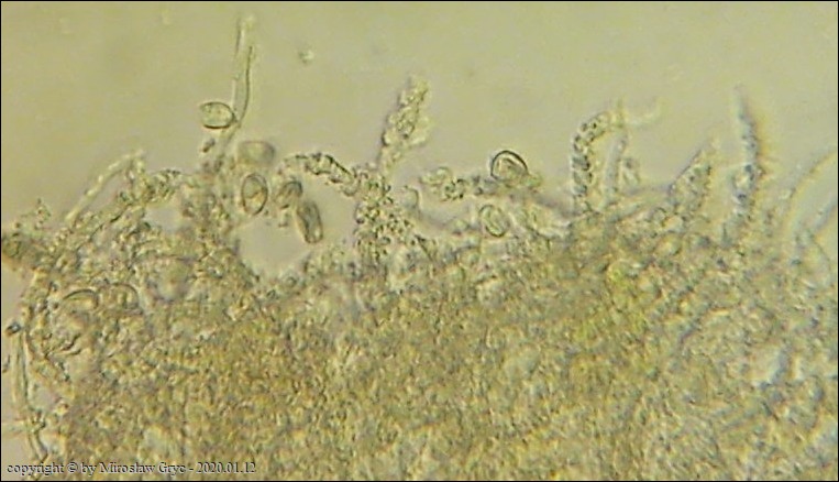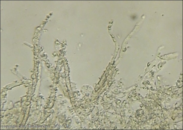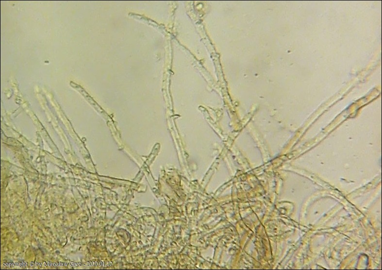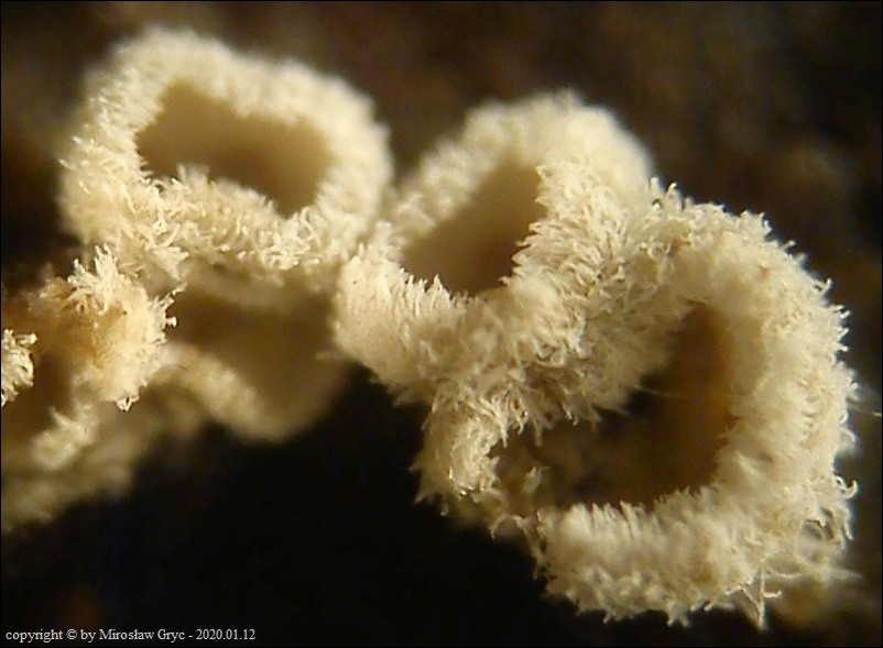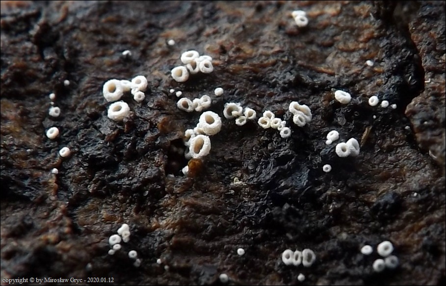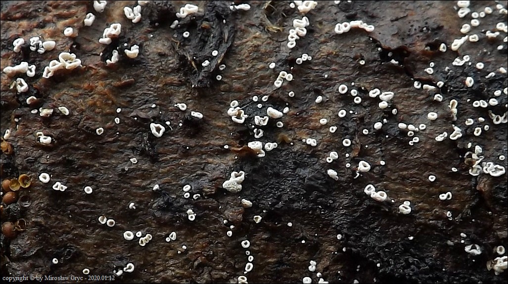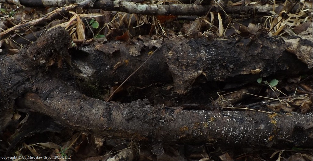 Substrat: Owocniki na martwym konarze liściastego, leżącego na kupie gałęzi.