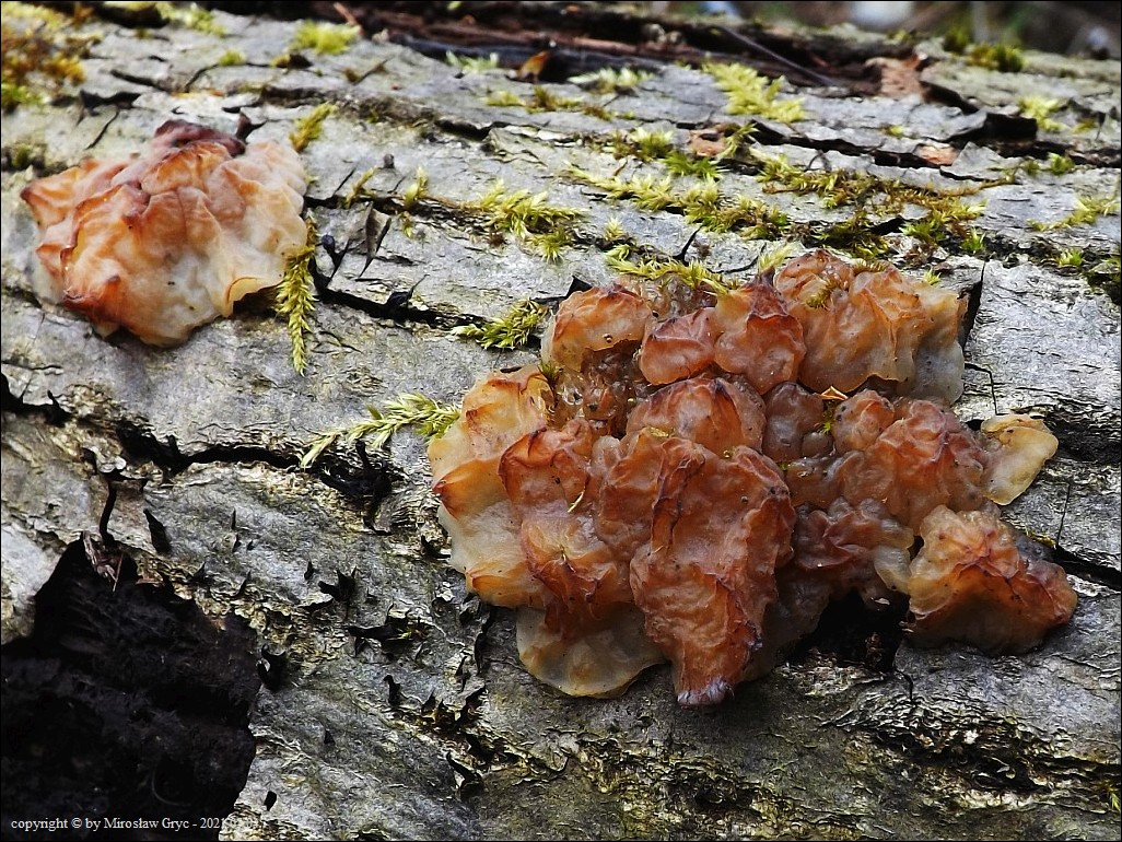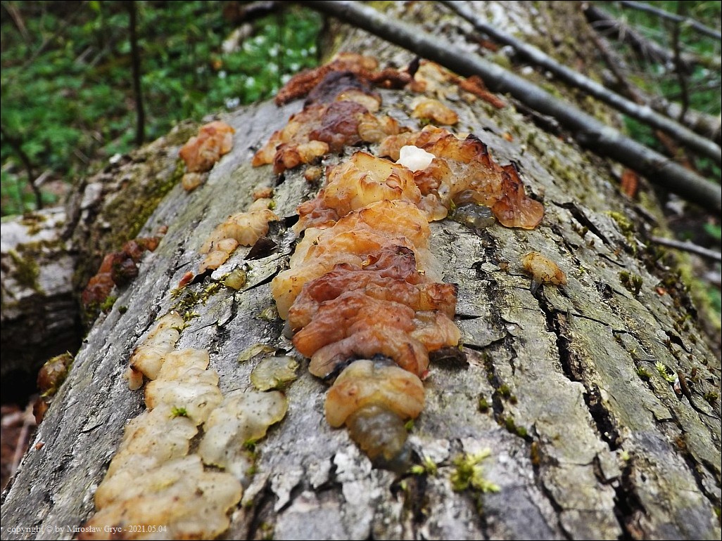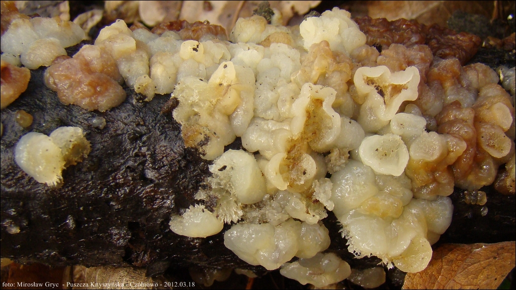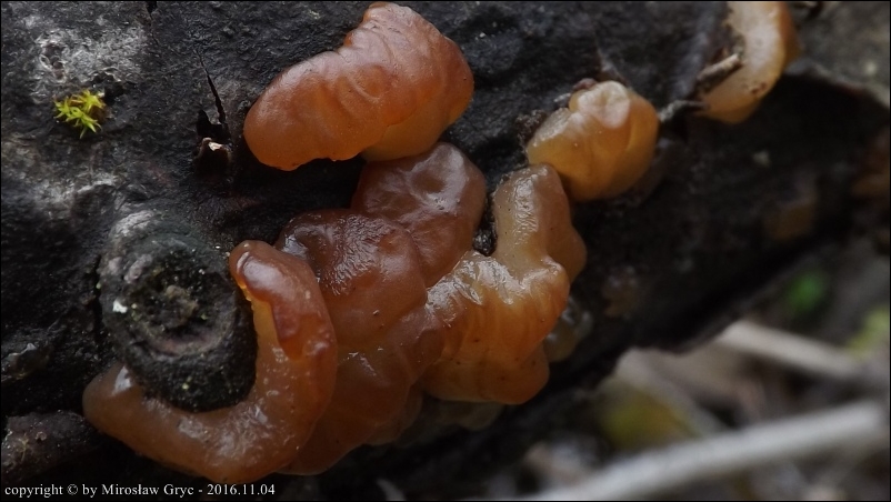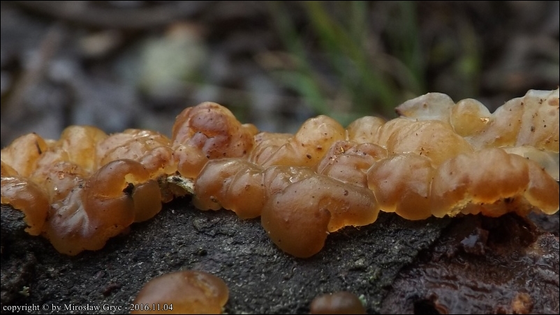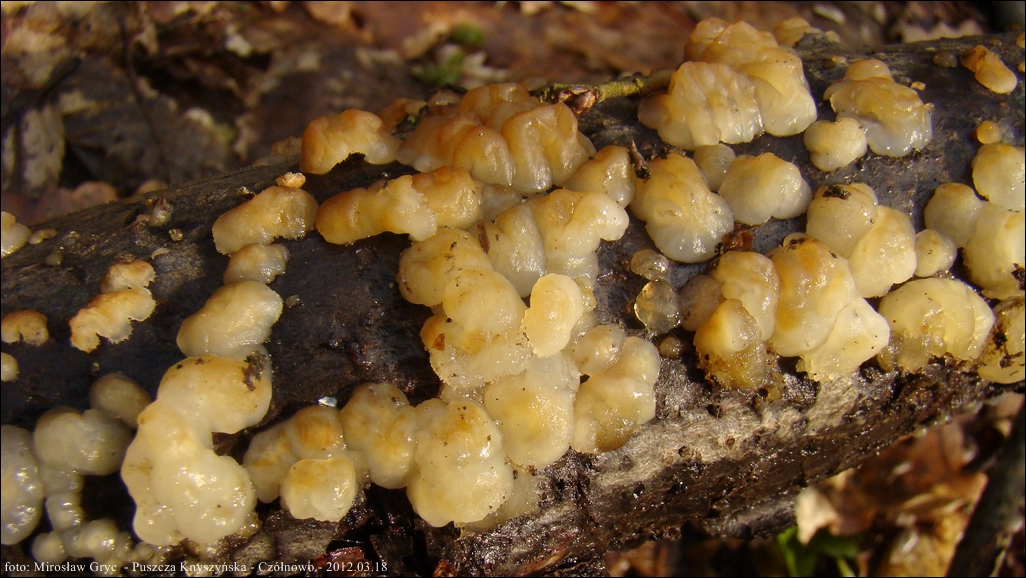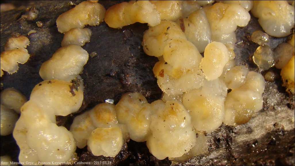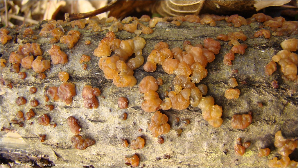 Tworzy owocniki o galaretowatej konsystencji, kształtem przypominające siedzące na drewnie bułeczki o pofalowanej powierzchni. Średnica ich waha się od 0.5 do 3.0 cm. W miarę wzrostu owocniki zlewają się z sobą pokrywając w tej sposób znaczną powierzchnię. Do substratu poszczególne owocniki przyrastają tylko w jednym miejscu, przeważnie centralną częścią owocnika. Owocniki młode od prawie przezroczystych (z reguły nieco mętne), do białawych i w tym stadium wzrostu są miękkie. Z wiekiem twardnieją, osiągając konsystencję chrząstki, a barwą upodobniając się do bursztynu.