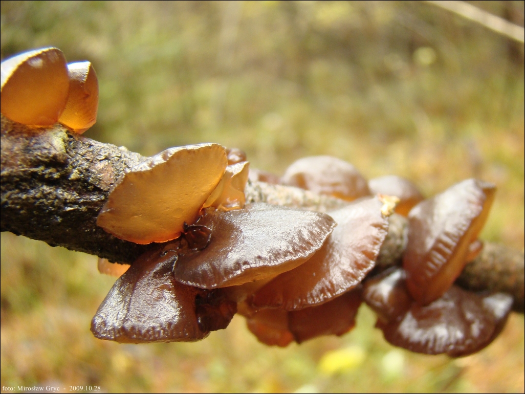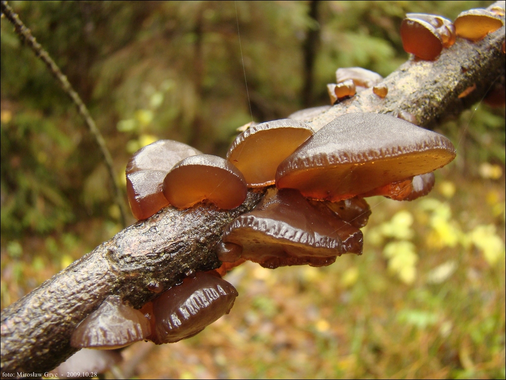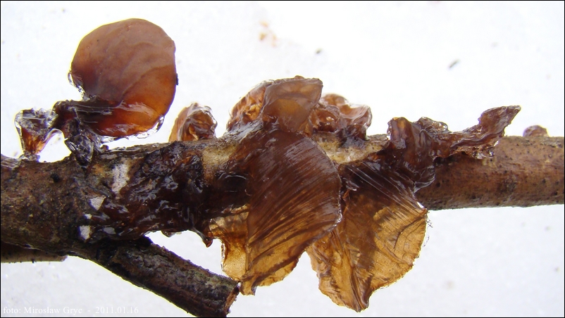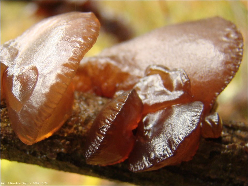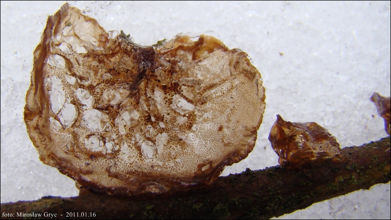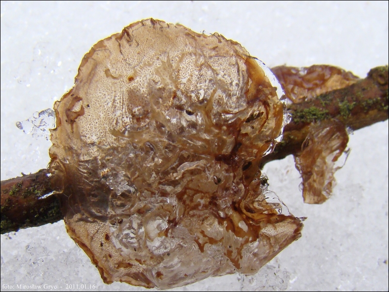 Gatunek ten wytwarza owocniki spłaszczone, o zarysie kulistym. Niektóre źródła podają że osiąga średnicą nawet 8 cm, takich jednak jeszcze nie spotkałem. Najczęściej ich średnica dochodzi do 2 cm. Do substratu przyrośnięte zazwyczaj bocznie ale nie jest to reguła, wszystko w tym przypadku zależy od ułożenia powierzchni na jakiej wyrastają. Owocnik zazwyczaj gładki, gdy nabrzmiały wodą, w czasie suszy i mrozów kurczy się nawet do grubości około 1 mm. Konsystencji miękkiej, galaretowatej, ale nie rozpływającej się, wyschnięte owocniki cienkie, kruche i łamliwe. Barwa owocników w młodym wieku żółtobrązowa, z wiekiem coraz bardziej ciemniejąca aż do czerwonobrązowej.