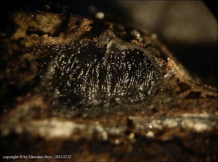 Substrat: Pień złamanej młodej olchy (Alnus sp.), częściowo leżący w wodzie.