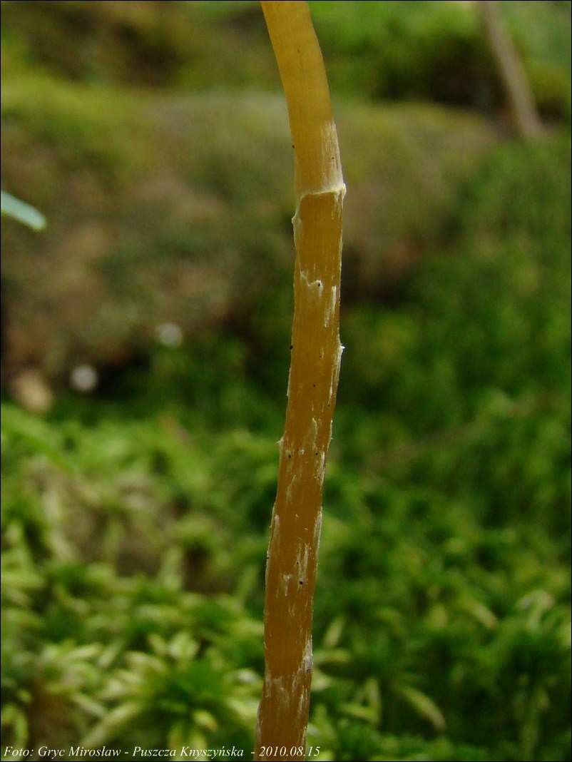 Trzon: bardzo długi a wszystko po to aby przebić sie przez grubą warstwę mchów; pierścień mały ale wyraźnie widoczny; powierzchnia nad pierścieniem gładka, poniżej pokryta charakterystycznym, jaśniejszym (w zasadzie białym) wzorkiem (łuseczkami); kruchy i łamliwy; barwy takiej samej jak cały owocnik czyli ochrowej.