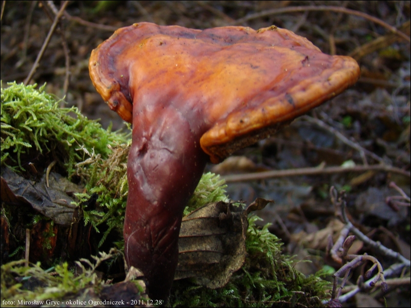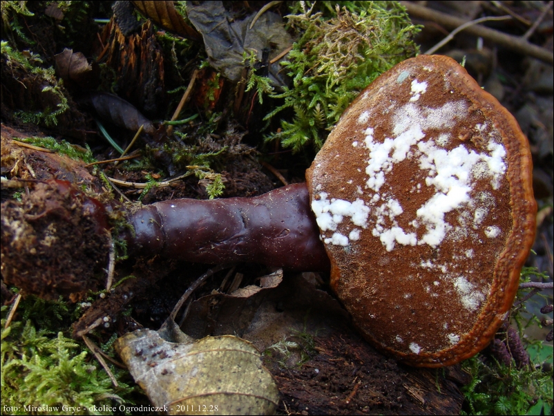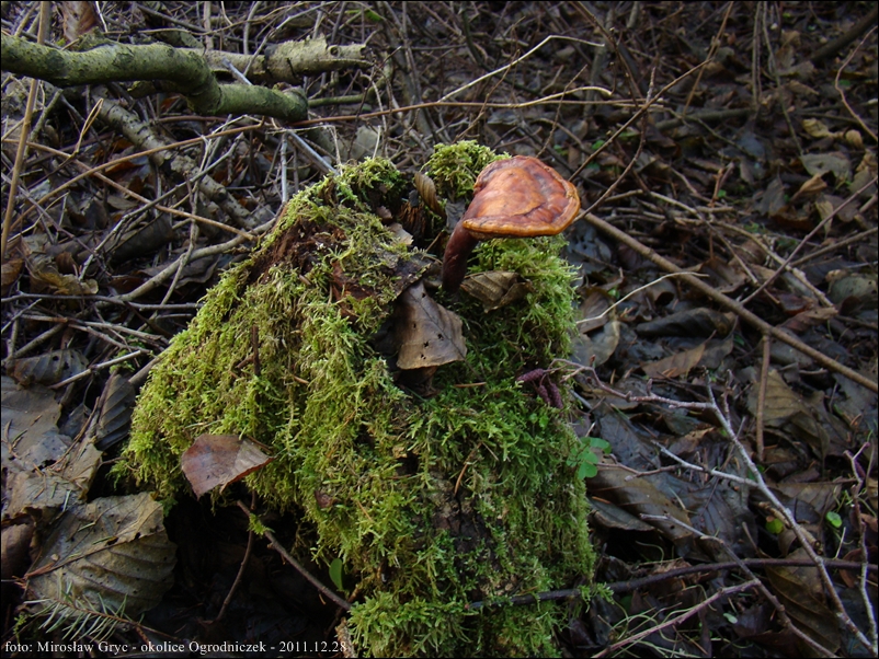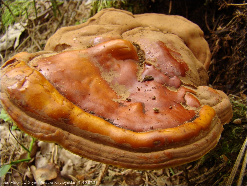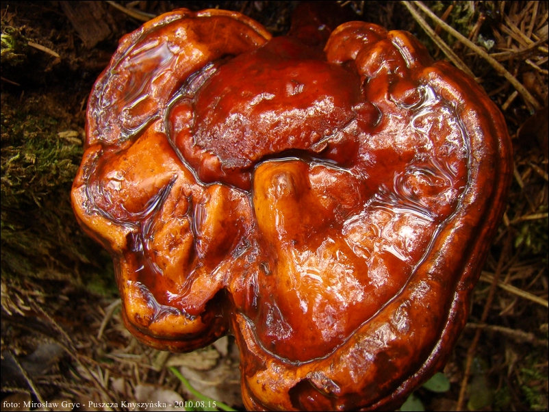 Owocnik: przeważnie jednoroczny, rzadko wieloletni; owocnik dojrzały składa się z trzonu, oraz przyrośnietego do niego (bocznie) płaskiego kapelusza; kapelusz kolisty, półkolisty lub też nerkowaty; młody kształtem przypomina jasno zabarwioną buławę ( patrz fot. 01-04), nastepnie, tworzy się na jej wierzchołku spłaszczenie, stopniowo przechodzące w kapelusz (fot. 06-08), w tym stadium trzon zaczyna nabierać właściwej ciemnobrązowej barwy a górna strona kapelusza stopniowo przebarwia się od jasnopomarańczowego w kierunku żółtobrązowego a następnie czerwonobrązowego; dojrzałe owocniki zazwyczaj są oprószone zarodnikami wobec czego sprawiaja wrażenie matowych, w rzeczywistości jednak ich górna powierzchnia jest mocno lśniąca; strefa przyrostu zabarwiona znacznie jaśniej, biaława lub żółtawa.