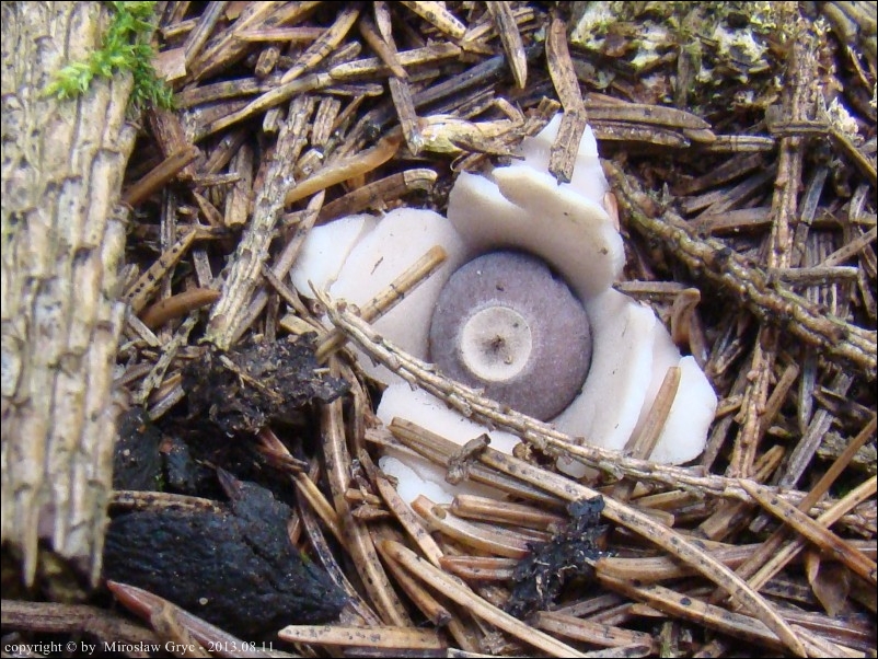 Osłona zewnętrzna (egzoperydium): pęka zazwyczaj na cztery płaty, rzadziej na 5-6; pęknięcia sięgają dość daleko, w niektórych przypadkach prawie do nasady główki; ramiona rozchylając się na zewnątrz unoszą owocnik wysoko nad ziemię, nie podwijają się pod spód; w trakcie rozchylania się płatów na boki, następuje równocześnie oddzielenie się zewnętrznej warstwy grzybniowej (osłony zewnętrznej od jej warstwy wewnętrznej - widoczne na zdjęciu głównym oraz 05 i 07 w galerii, na dole strony); wewnętrzna warstwa osłony zewnętrznej barwy szaropopielatej, zewnetrzna natomiast gładka, nieregularnie pomarszczona, początkowo biaława, po wyschnieciu ochrowobrązowa.