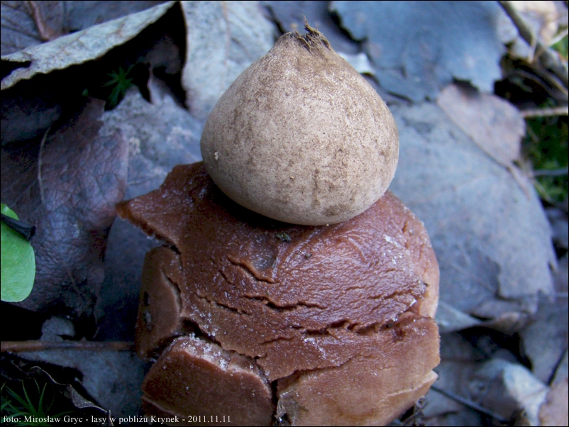 Owocnik: w początkowym stadium rozwoju kształtu kulistego, ze stożkowatym uwypukleniem na szczycie, zazwyczaj całkowicie zagrzebany w ściółce; średnicy do 5 cm; powierzchnia zewnętrzna pokryta grzybnią w części dolnej przerośniętą z glebą.