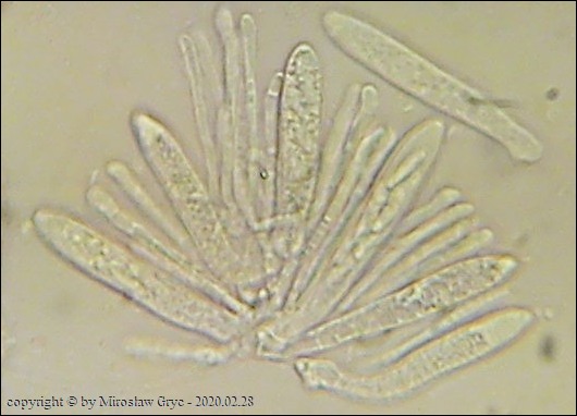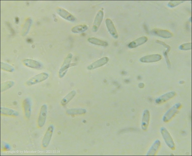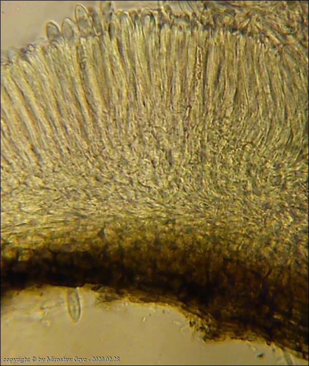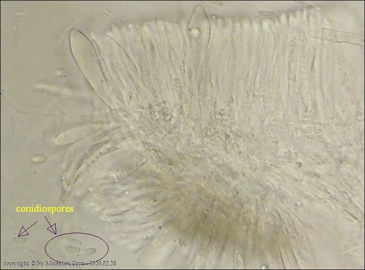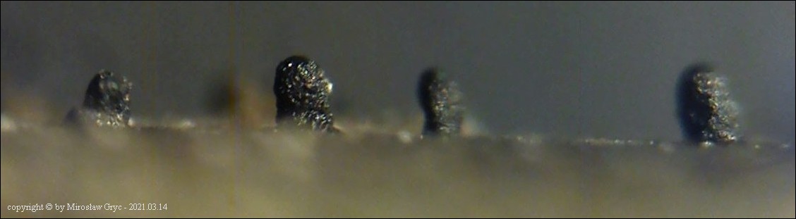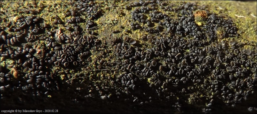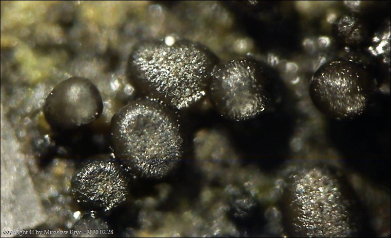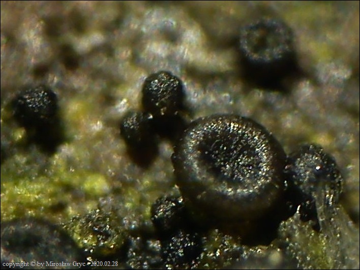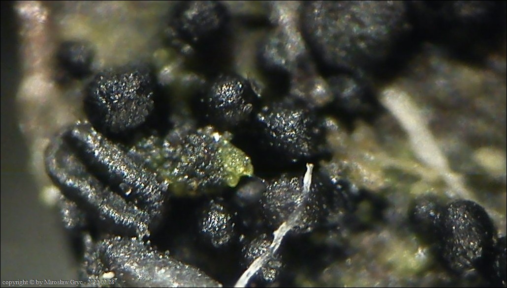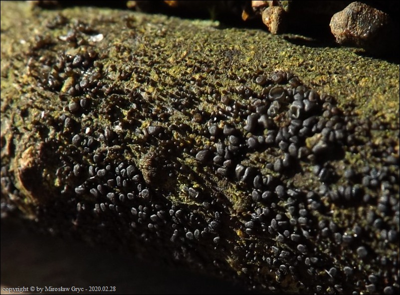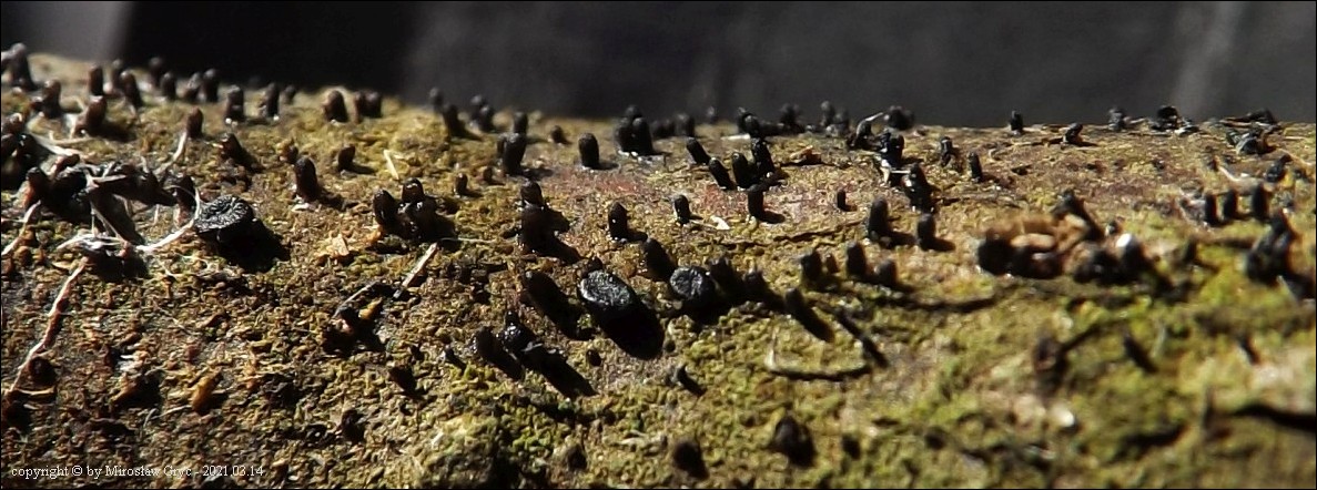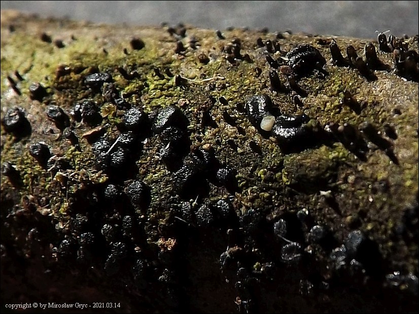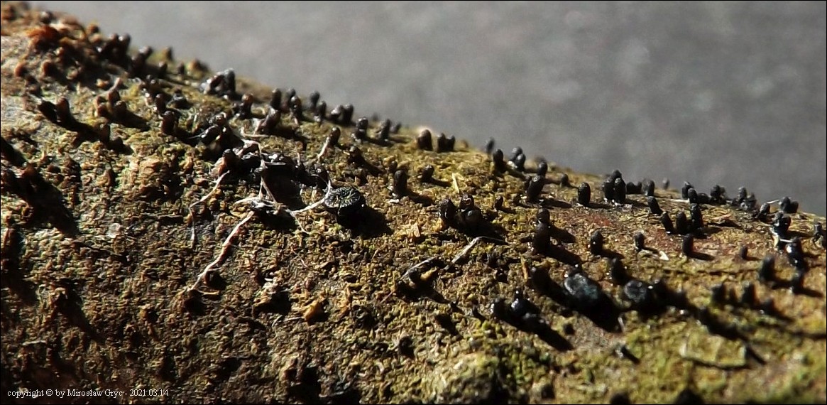 Substrat: Owocniki na fragmencie martwej gałązki czeremchy zwyczajnej (Prunus padus).
