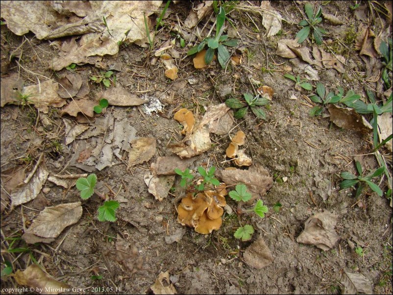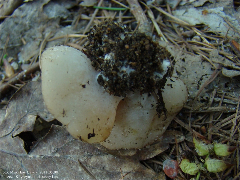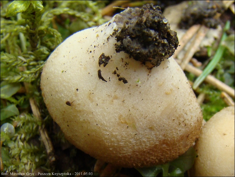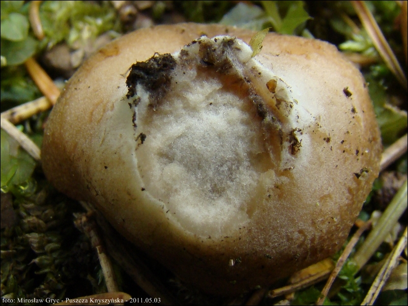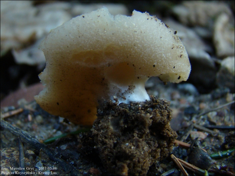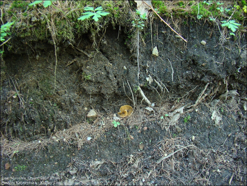 Dodam tylko, że równocześnie z moimi, dojrzewały owocniki na stanowisku na Kaszubach. Zlokalizował je Mirosław Wantoch-Rekowski. W związku z tym, praktycznie w tym samym czasie, zlokalizowane zostały dwa nowe stanowiska tego gatunku, do tej pory nie notowanego w Polsce. W moim przypadku nie było to jedno stanowisko. Pierwsze grzybki tego gatunku znalazłem w Puszczy Knyszyńskiej na skraju drogi leśnej. Około 6 km na płn-wsch. od Supraśla. Te grzyby nie doczekały jednak sprawdzenia pod mikroskopem. Wcześniej pobrane były jeszcze zbyt młode a te co pozostały, uległy zniszczonu w trakcie prac leśnych. Fakt ten zmobilizował mnie do ich poszukiwań w innym rejonie P.K. a mianowicie w leśnictwie Krasny Las. Szybko je zlokalizowałem, rosnące na poboczu drogi leśnej, biegnącej w głąb lasu, w kierunku płd-wsch, od siedziby tegoż leśnictwa (Krasny Las). Nie było to jednak jedno stanowisko. Owocniki wyrastały po 1-3 sztuk na przestrzeni około 1 km długości tej drogi. Podłoże wilgotne, błotnisto-gliniane, ale też i w niektórych przypadkach gliniasto-piaszczyste. Charakter lasu w ich przypadku raczej nie odgrywa większej roli. Znajdowałem je zarówno w drzewostanie iglastym, jak też i liściastym, rosnące bezpośrednio na ziemi.