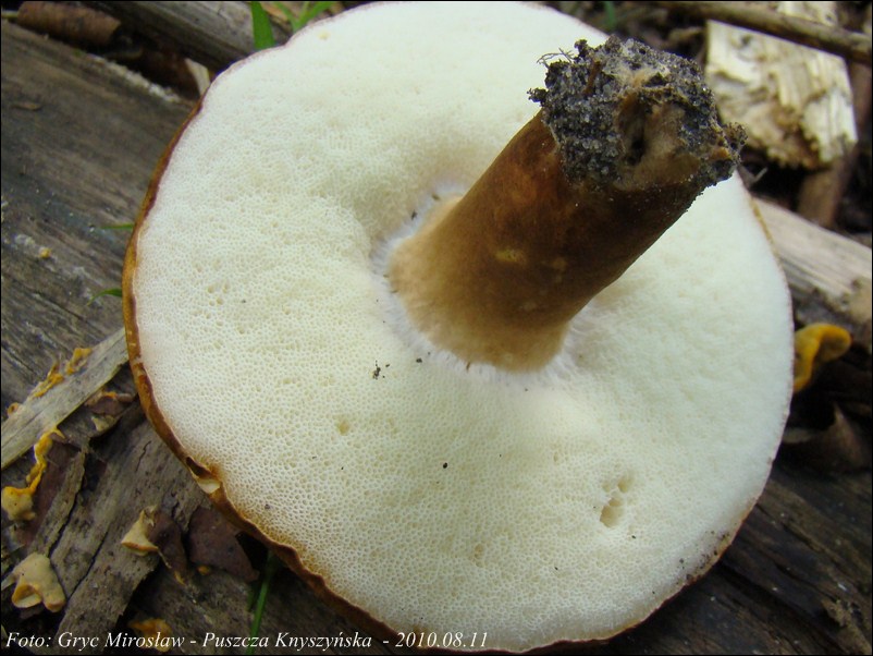 Hymenofor: rurkowy; rurki barwy początkowo białe, z wiekiem żółknące, niekiedy z zielonkawym odcieniem, przy trzonie zatokowato wycięte, stosunkowo mocno zrośnięte z miąższem kapelusza; pory barwy tej samej co rurki, średnicy do 1 mm, po uciśnięciu w zasadzie niezmienne, ewentualnie bardzo lekko ciemniejące.