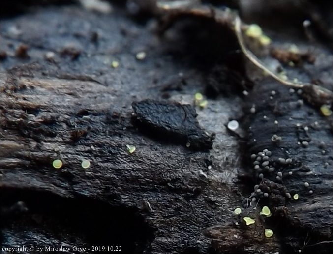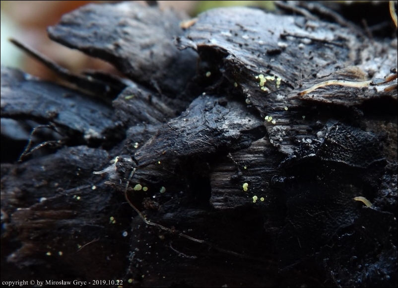 Substrat: Owocniki na szyszkach świerkowych leżących na wilgotnej ziemi.