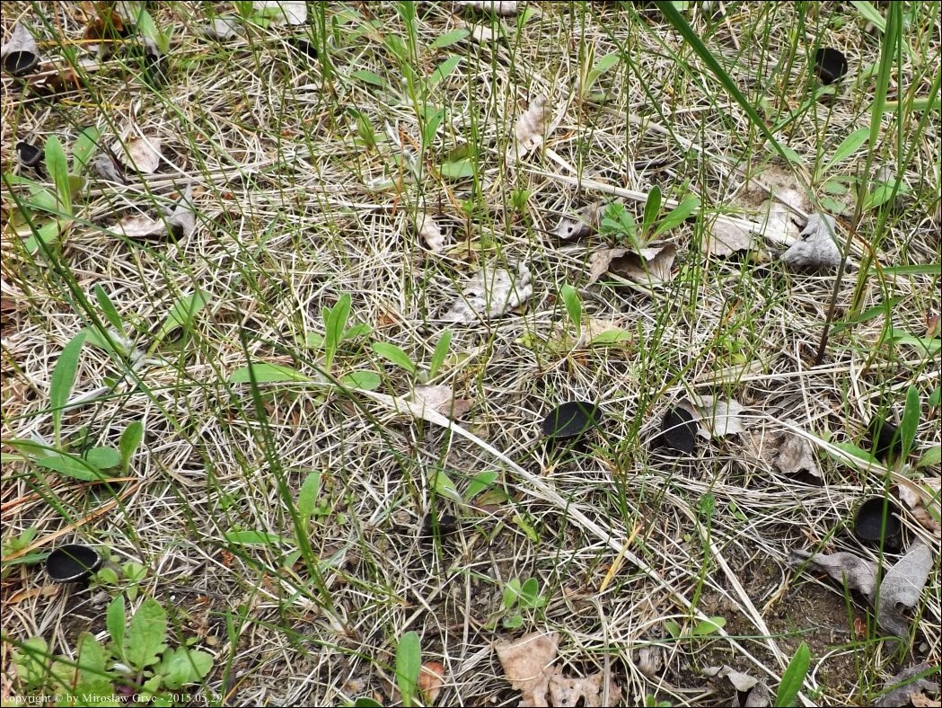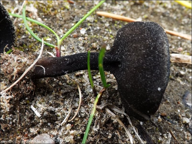 Substrat: Kilkanascie owocników wjednej grupce, na dnie wykopaliska z rzadka porośnietego sosenkami. Podłoże żwirowe.