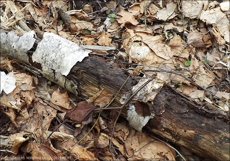 Substrat: Dolna strona fragmentu pnia brzozy, leżacego na ziemi.