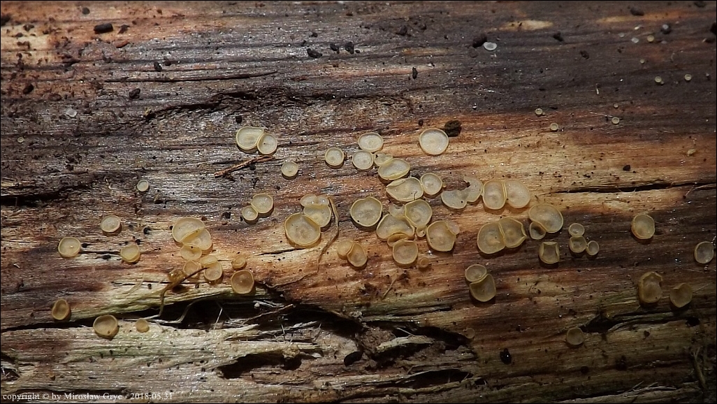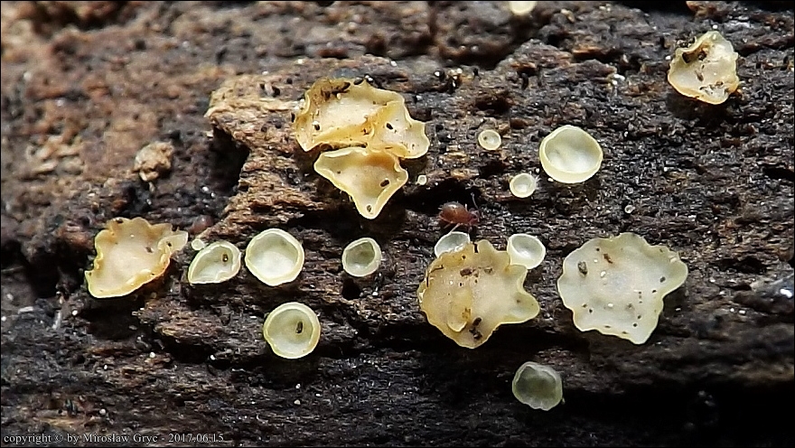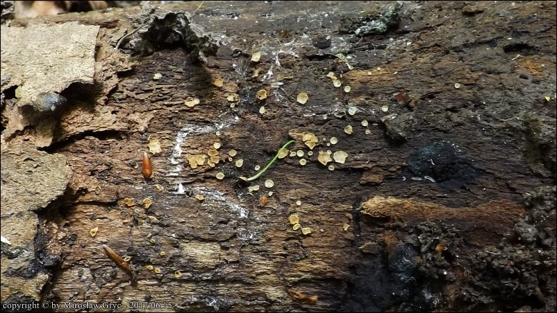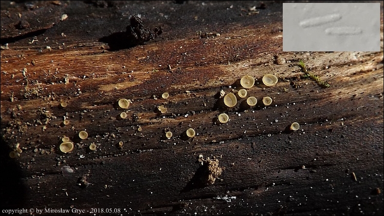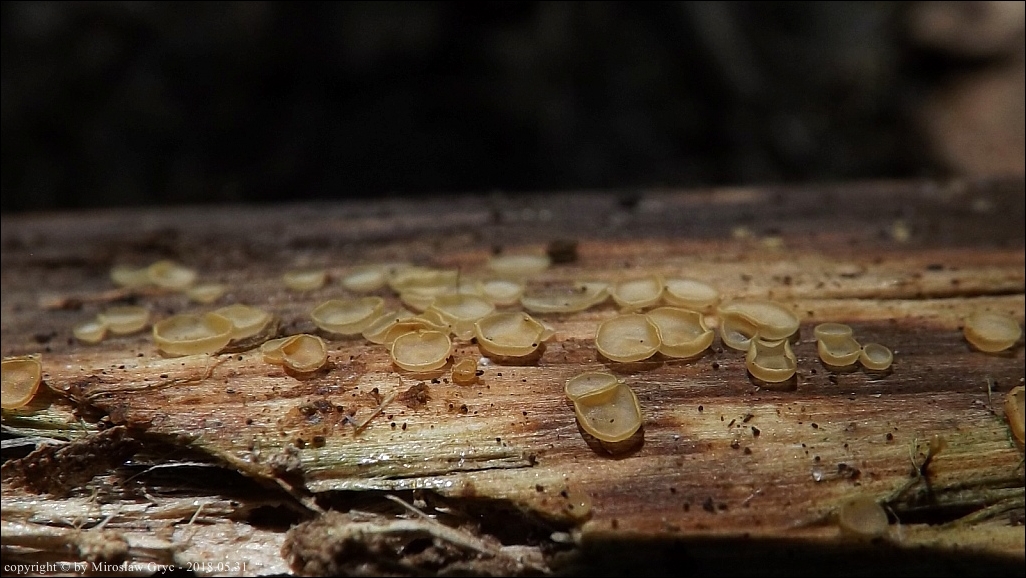 Substrat: Owocniki na dolnej stronie fragmentu drewna, leżącego na wilgotnym podłożu.
