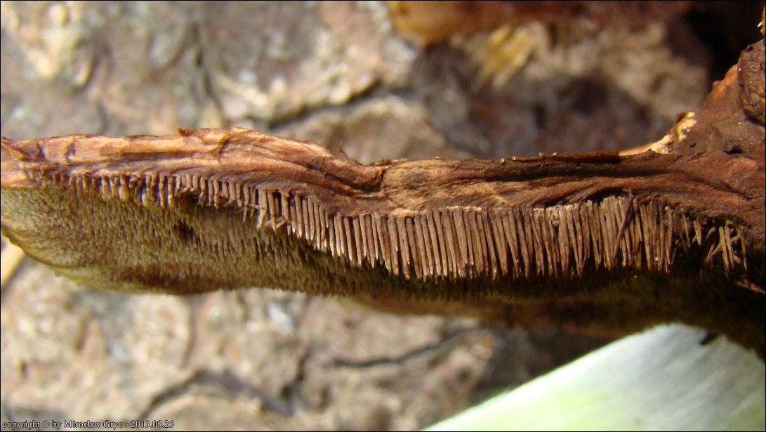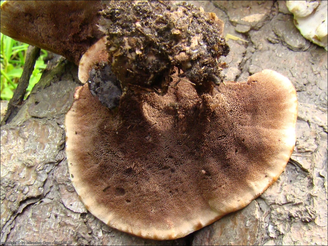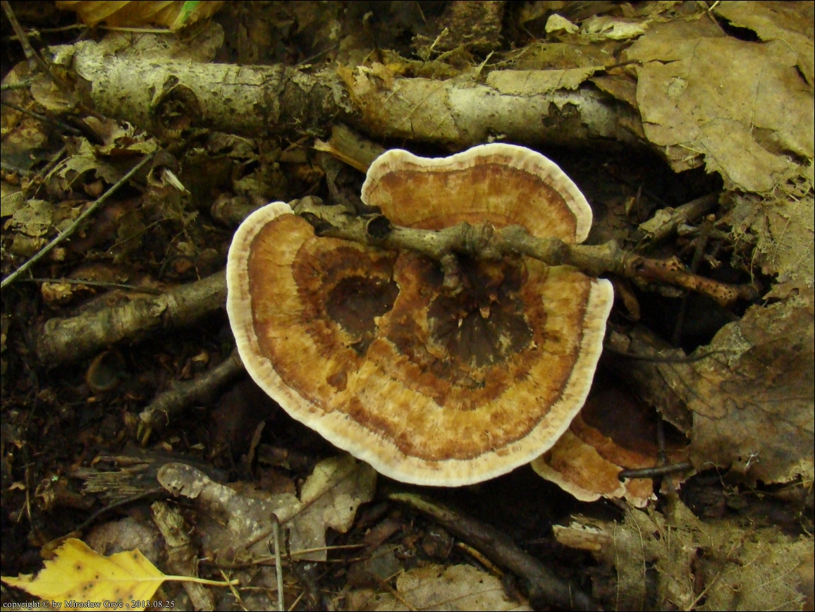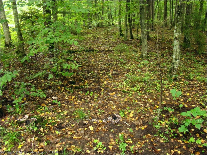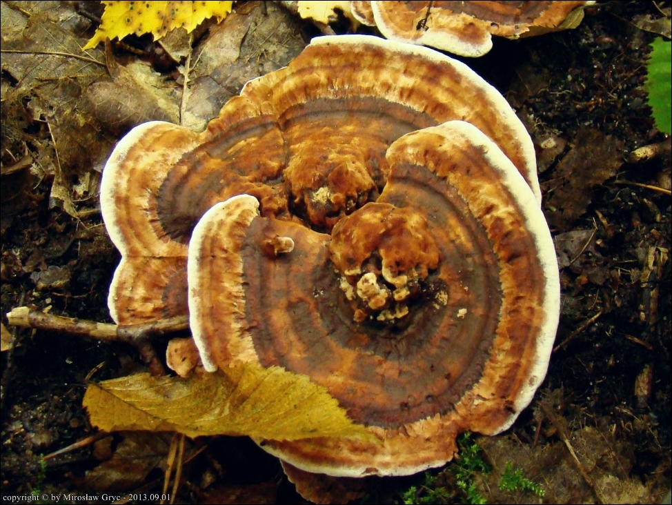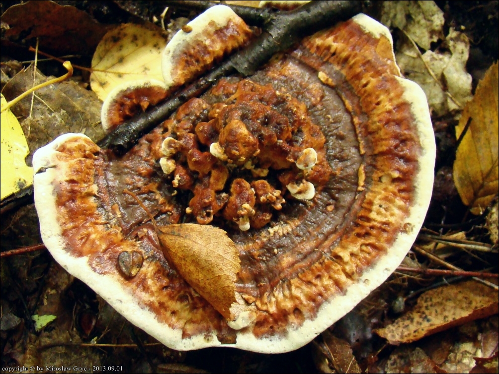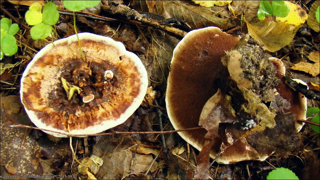 Notatka: Stanowisko oddalone od spotkanego poprzednio w tym rejonie (tj. 2013.08.25) o około 1 km. Drzewostan mieszany: grab, rzadziej świerk, brzoza, topola. Sytuacja analogiczna jak w poprzednim przypadku, owocniki wyrastały w czarcim kręgu wraz z Phellodon confluens.