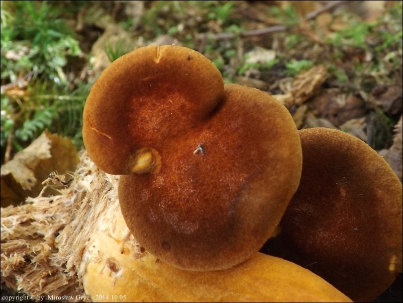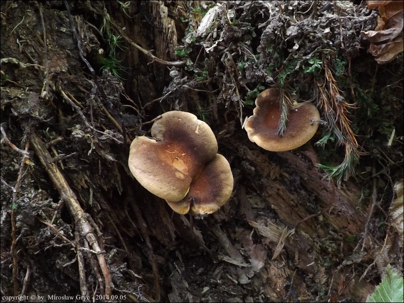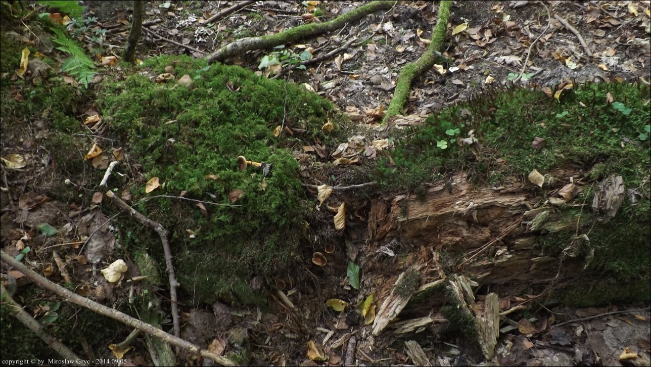 Siedlisko / Substrat: Fragment lasu o charakterze pierwotnym, grupka owocników na leżącym na ziemi, całkowicie zbutwiałym pniu.