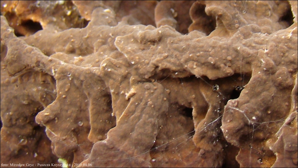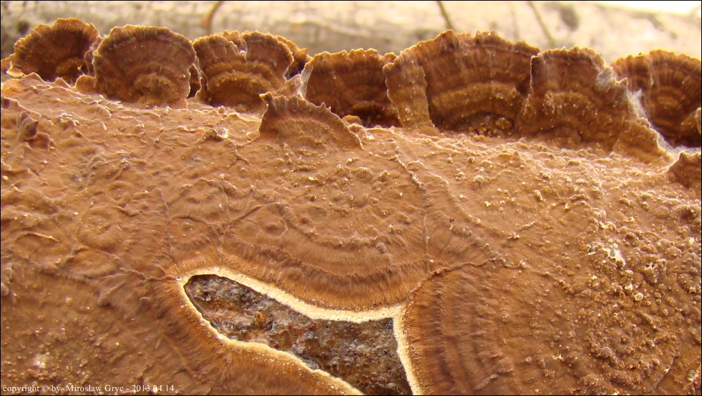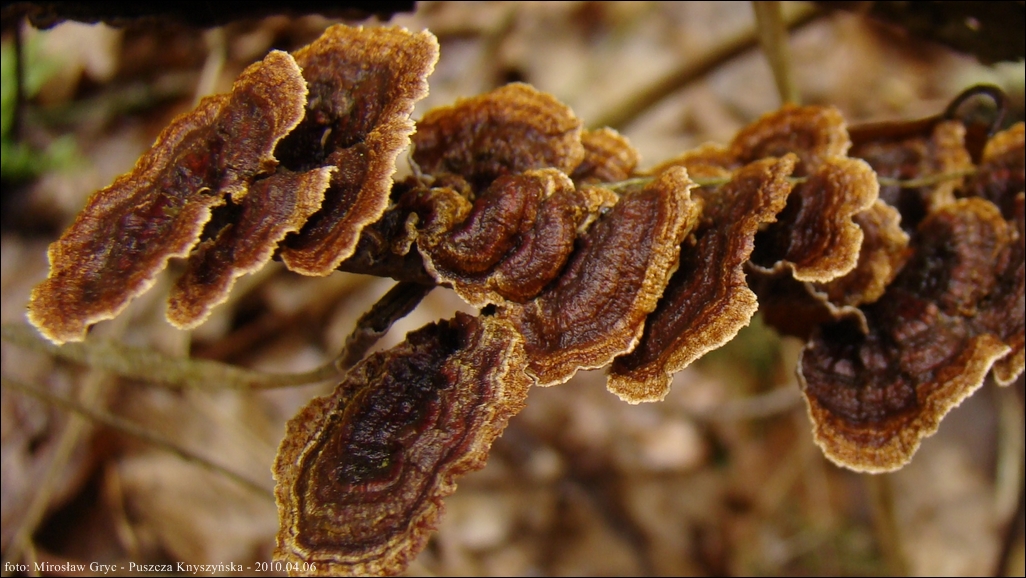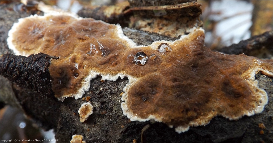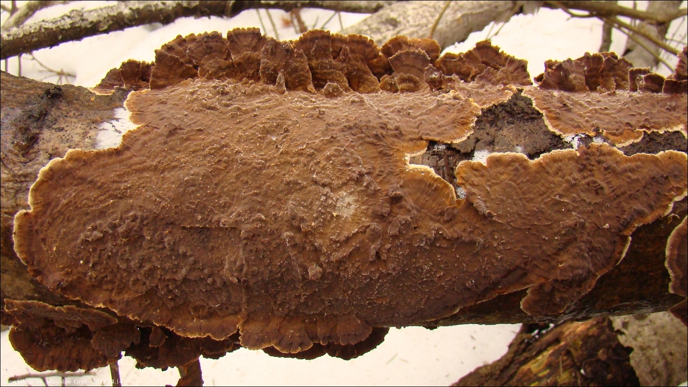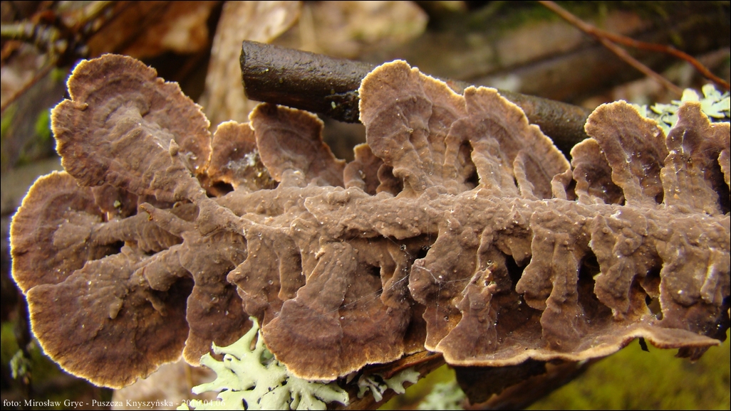 Owocnik: bardzo cienki, przeważającą powierzchnią przylegający do substratu; tworzący długie kilku- lub kilkunastocentymetrowe płaty, z lekka odstającymi brzegami, w niektórych przypadkach, znacznie bardziej odstające, w zależności od charakteru podłoża (patrz zdjęcia w galerii: 01-03), również występuje o ułożeniu dachówkowatym, wyrasta przeważnie na spodniej stronie gałęzi i daje się z łatwością od niej oderwać; górna powierzchnia za młodu pomarańczowobrązowa, z wiekiem coraz bardziej szarobrązowa, z wyrażnie jaśniejszym, w czasie przyrostu, złotobrązowym brzegiem; brzeg wyraźnie pofalowany, karbowany; góra owocnika lekko filcowata; hymenofor barwy tabaczkowatobrązowej, kawowobrązowej, o powierzchni nieregularnie gruzełkowatej (fot. 04-05).