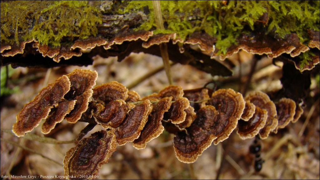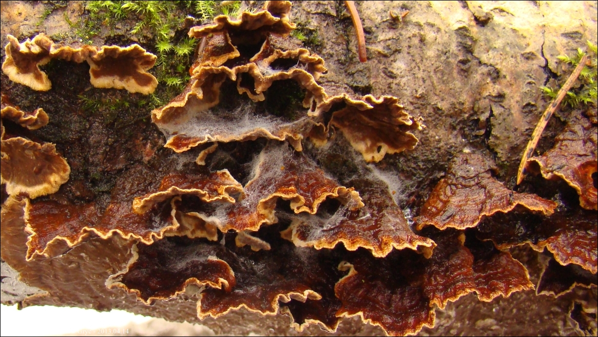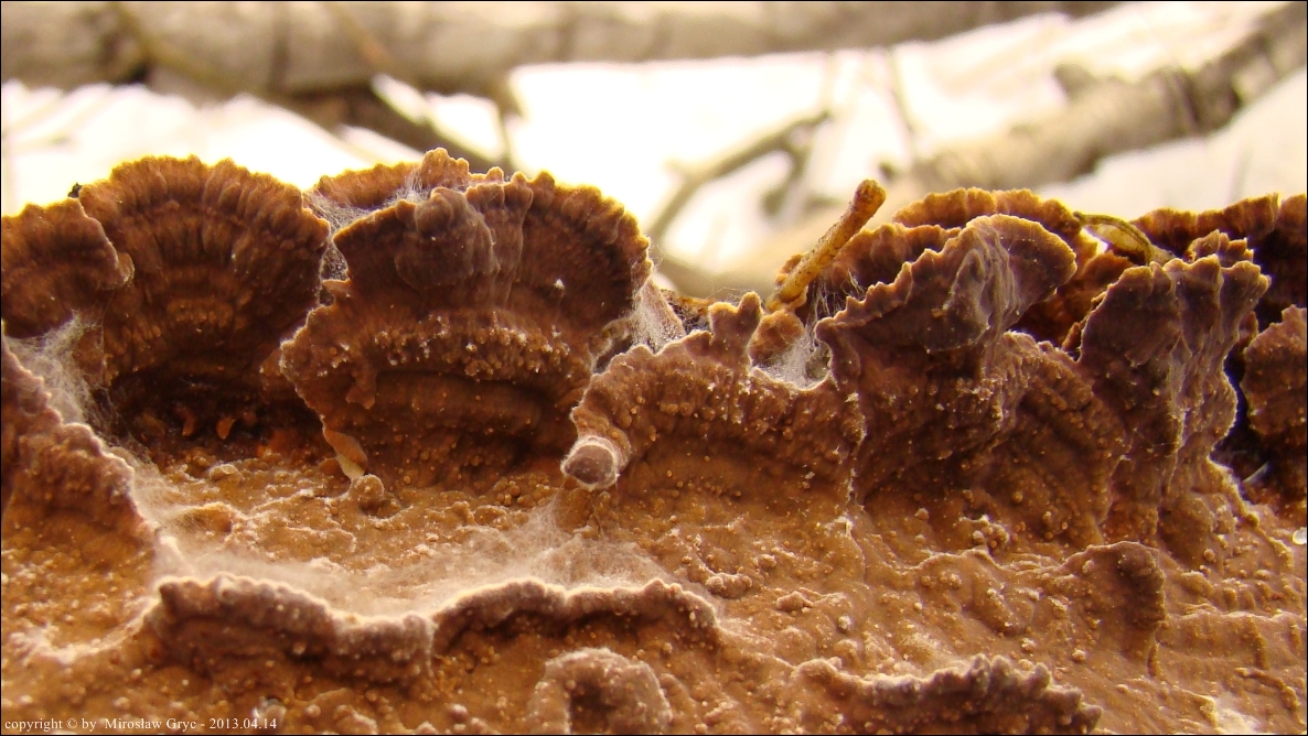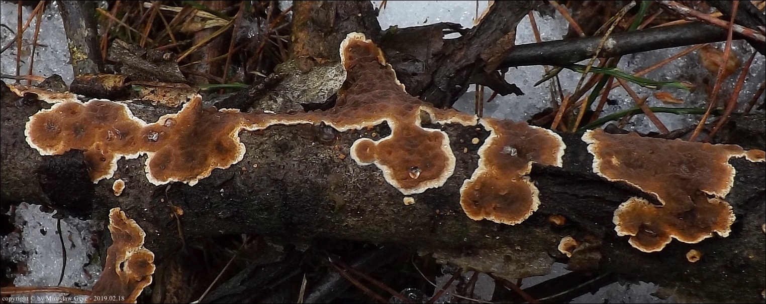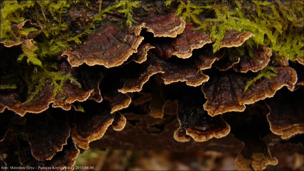 Owocnik: bardzo cienki, przeważającą powierzchnią przylegający do substratu; tworzący długie kilku- lub kilkunastocentymetrowe płaty, z lekka odstającymi brzegami, w niektórych przypadkach, znacznie bardziej odstające, w zależności od charakteru podłoża (patrz zdjęcia w galerii: 01-03), również występuje o ułożeniu dachówkowatym, wyrasta przeważnie na spodniej stronie gałęzi i daje się z łatwością od niej oderwać; górna powierzchnia za młodu pomarańczowobrązowa, z wiekiem coraz bardziej szarobrązowa, z wyrażnie jaśniejszym, w czasie przyrostu, złotobrązowym brzegiem; brzeg wyraźnie pofalowany, karbowany; góra owocnika lekko filcowata; hymenofor barwy tabaczkowatobrązowej, kawowobrązowej, o powierzchni nieregularnie gruzełkowatej (fot. 04-05).