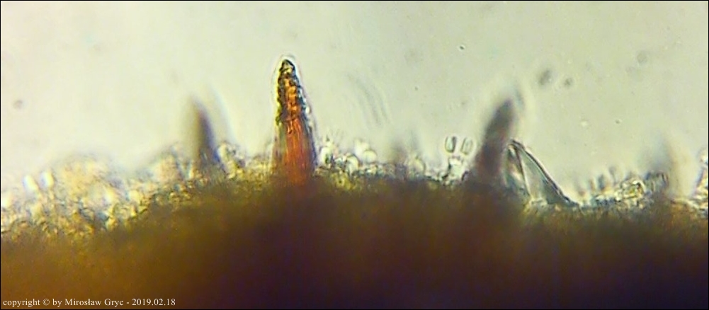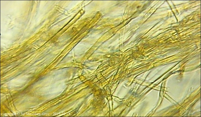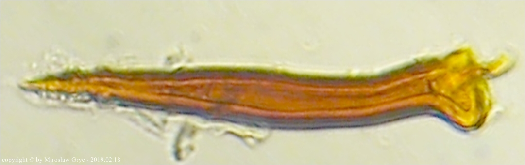 Zarodniki cylindryczne, nieco wygięte, gładkie, hialinowe, nieamyloidalne.