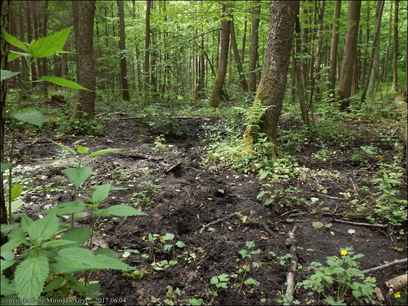 Siedlisko: Wilgotna niecka w terenie, zadrzewienie w większości liściaste.