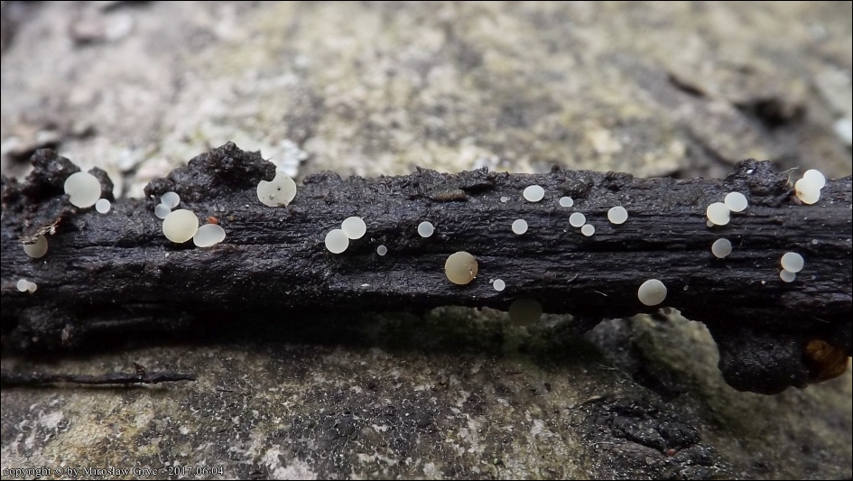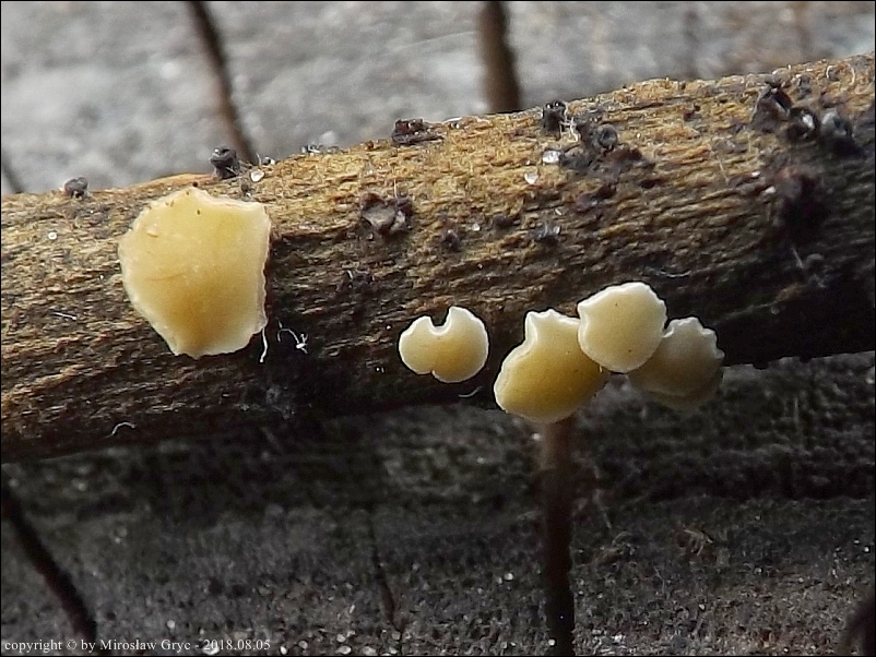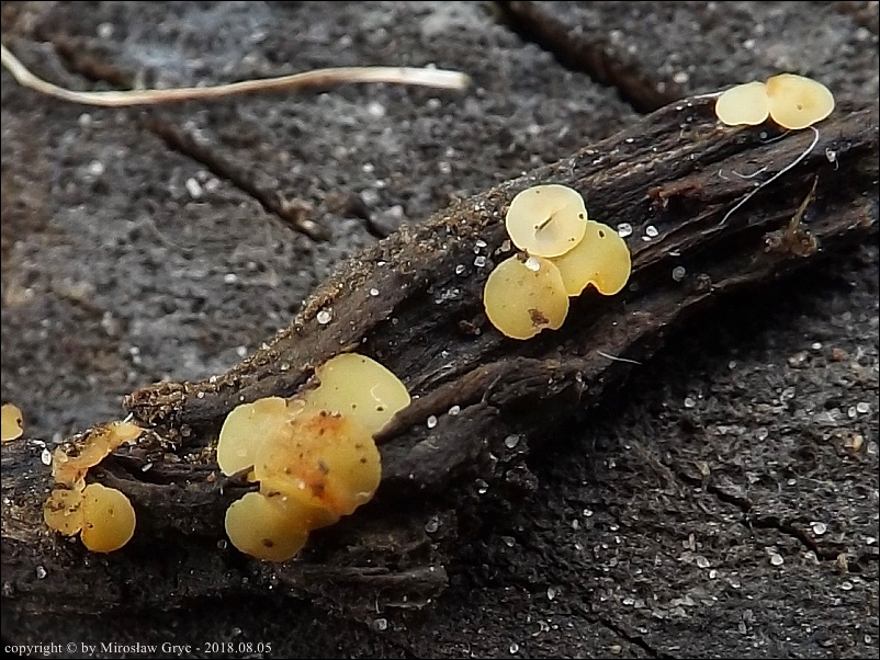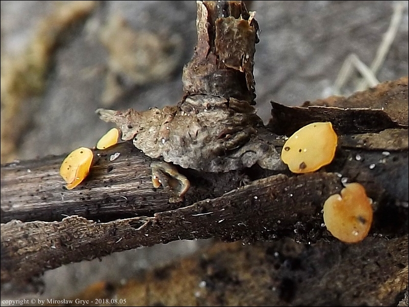Substrat: Owocniki na leżącym na mokrej ziemi kawałku gałązki, pochodzenia nieznanego.