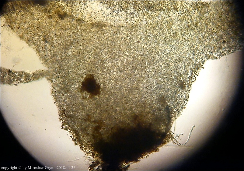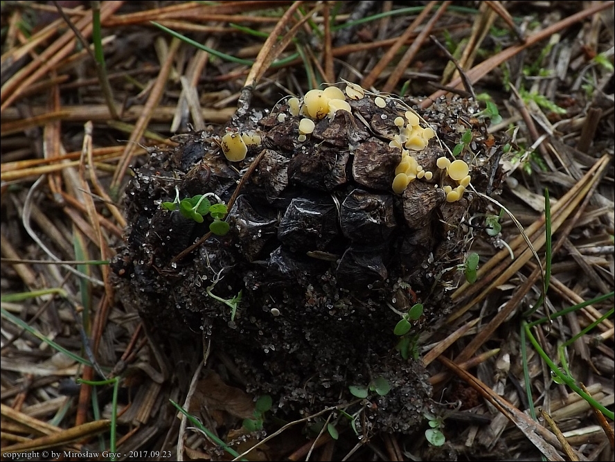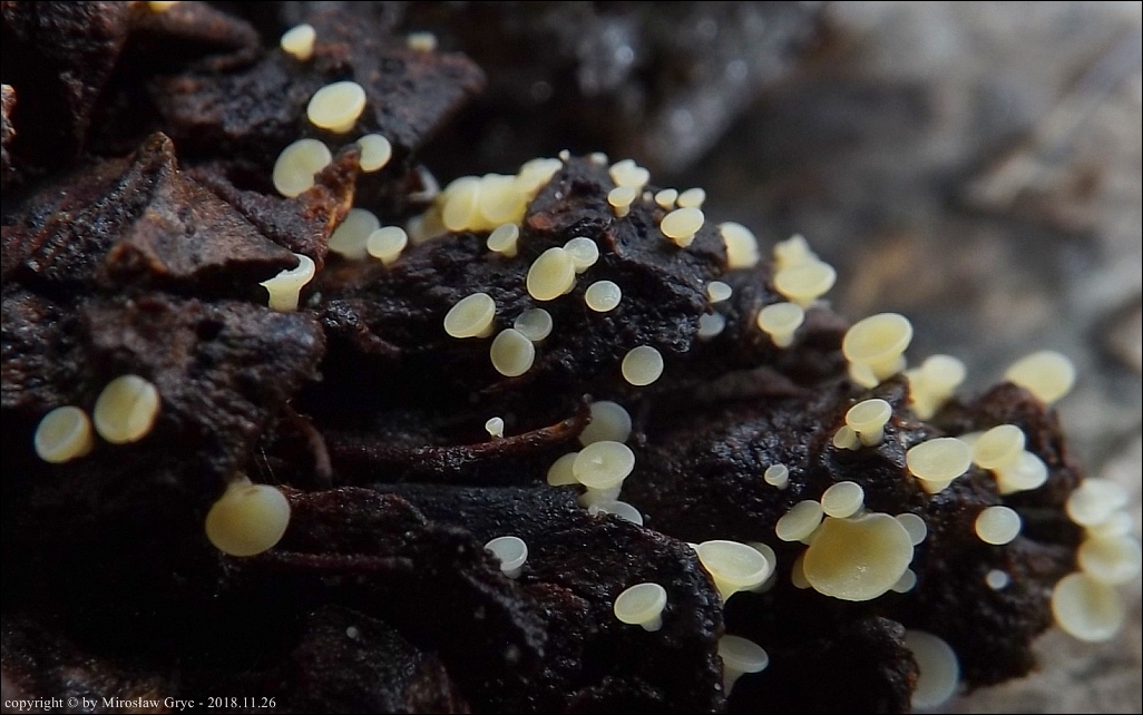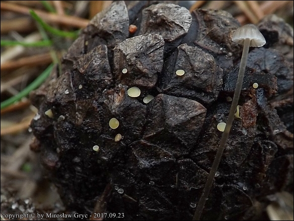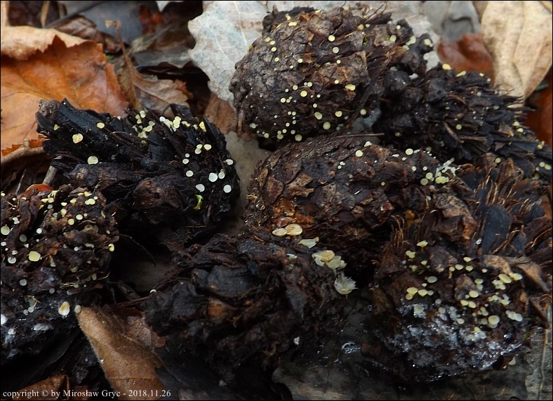 Substrat: Owocniki na szyszkach sosnowych, częściowo wgniecionych w podłoże.