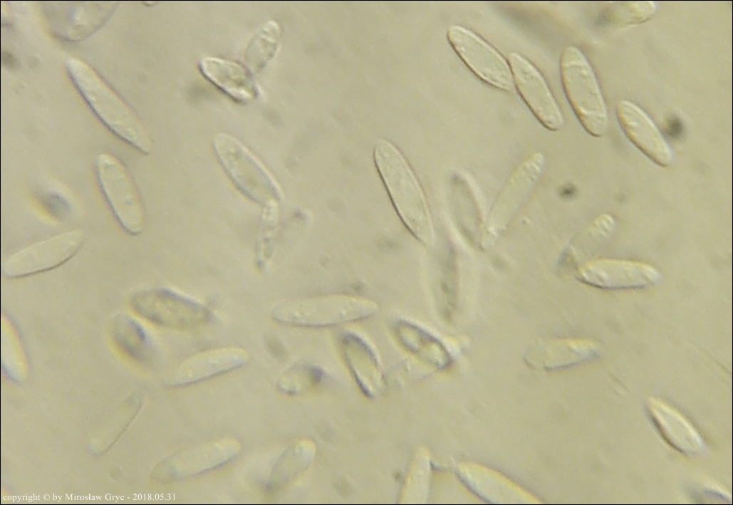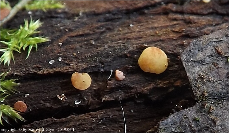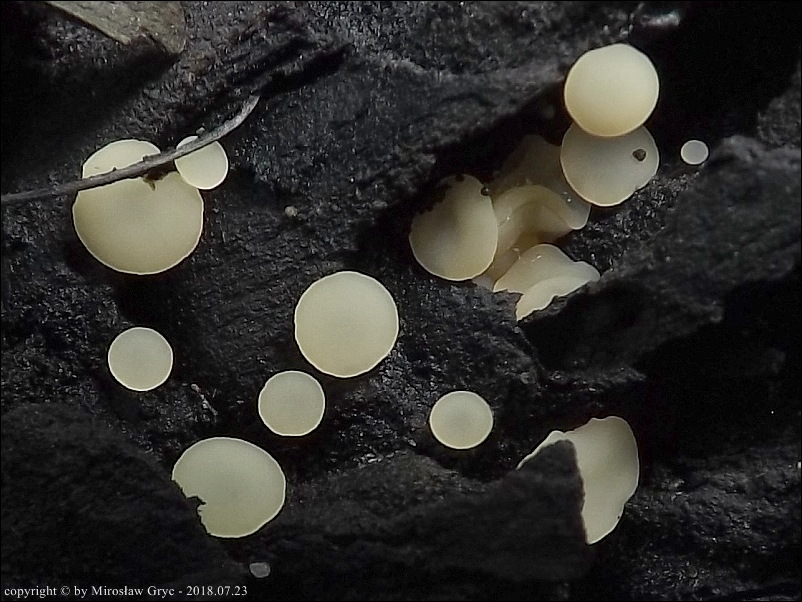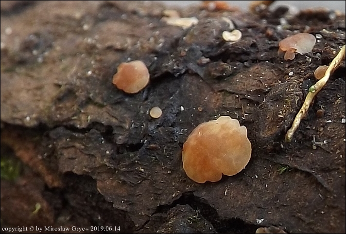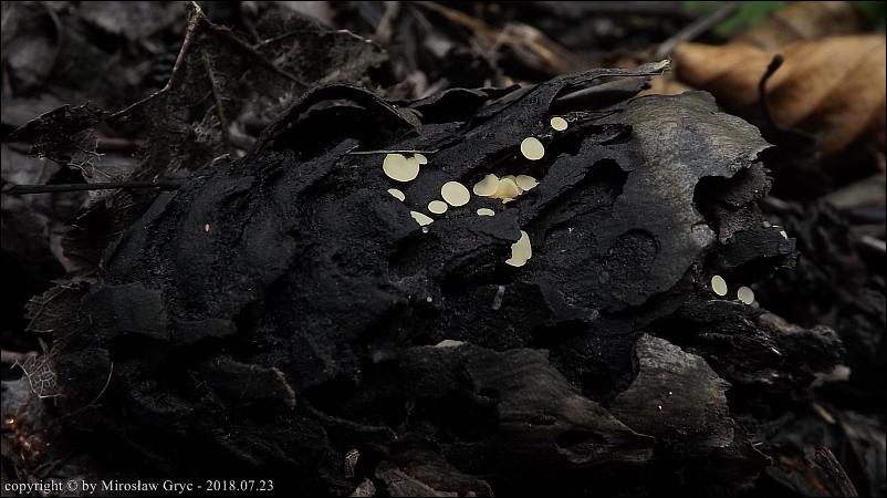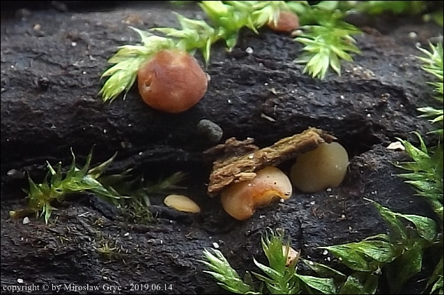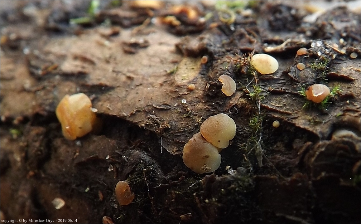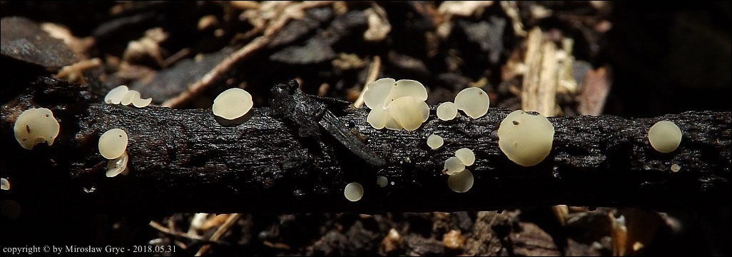 Substrat: Owocniki na leżącym na mokrej ziemi kawałku gałązki, możliwe, że pochodzący z olchy.