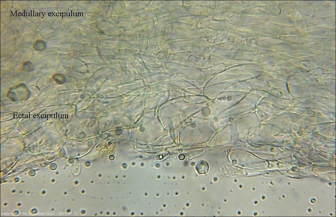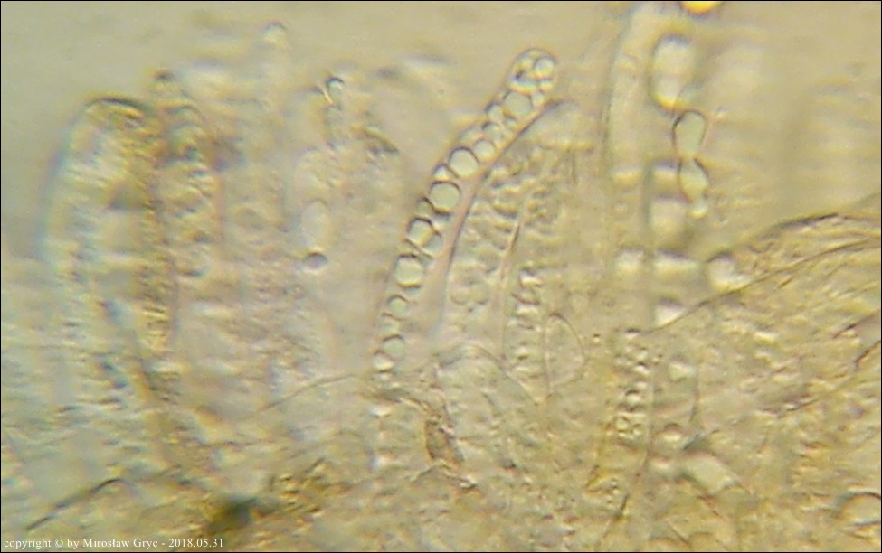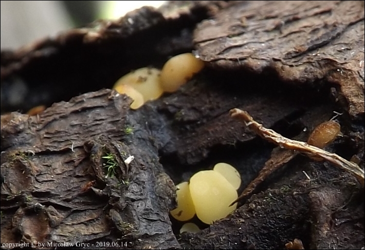 Substrat: Znalezisko interesujące ze wzgledu na substrat. Owocniki wyrastały na świerkowej szyszce, leżącej na błotnistej ziemi.